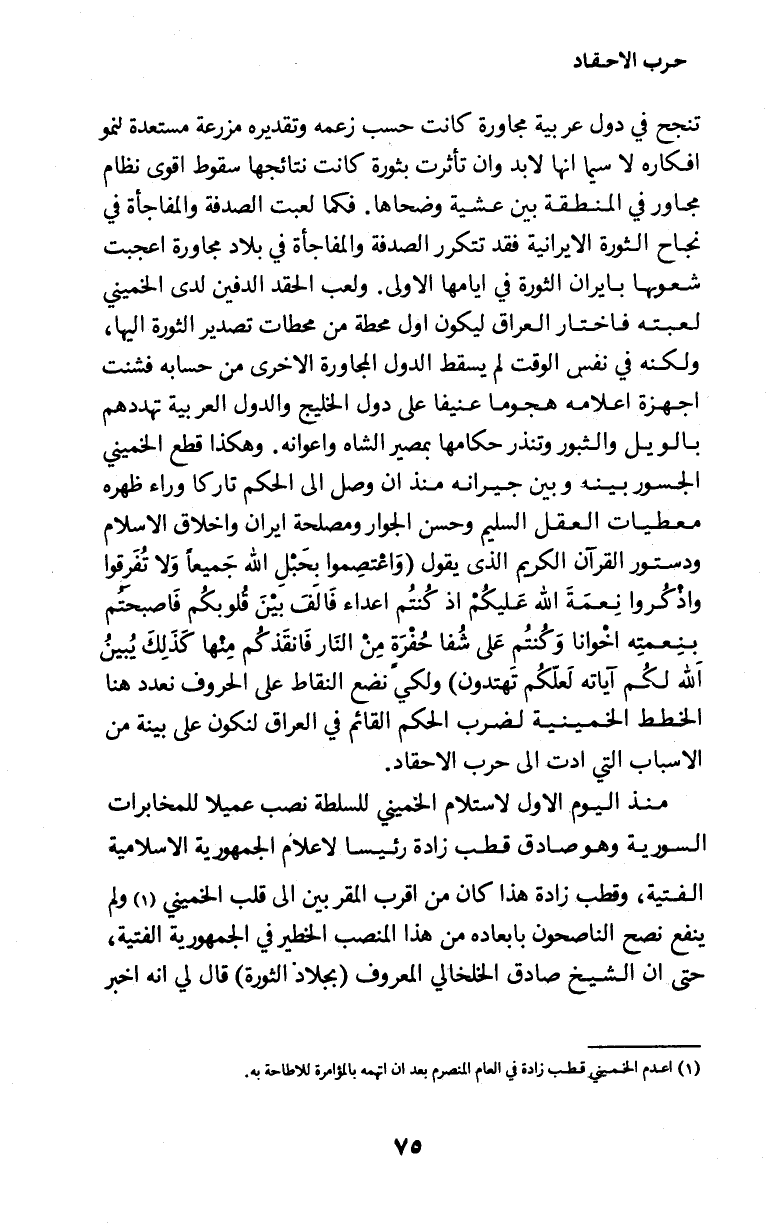 تنجح في دول عربية مجاورة كانت حسب زعمه وتقديره مزرعة مستعدة لنمو افكاره لا سيما انها لابد وان تأثرت بثورة كانت نتائجها سقوط اقوى نظام مجاور في المنطقة بين عشية وضحاها. فكما لعبت الصدفة والمفاجأة في نجاح الثورة الايرانية فقد تتكرر الصدفة والمفاجأة في بلاد مجاورة اعجبت شعوبها بايران الثورة في ايامها الاولى. ولعب الحقد الدفين لدى الخميني لعبته فاختار العراق ليكون اول محطة من محطات تصدير الثورة اليها، ولكنه في نفس الوقت لم يسقط الدول المجاورة الاخرى من حسابه فشنت اجهزة اعلامه هجوما عنيفا على دول الخليج والدول العربية تهددهم بالويل والثبور وتنذر حكامها بمصير الشاه واعوانه. وهكذا قطع الخميني الجسور بينه وبين جيرانه منذ ان وصل إلى الحكم تاركا وراء ظهره معطيات العقل السليم وحسن الجوار ومصلحة ايران واخلاق الاسلام ودستور القرآن الكريم الذى يقول (وَاعْتَصِمُواْ بِحَبْلِ اللهِ جَمِيعاً وَلاَ تَفَرَّقُواْ وَاذْكُرُواْ نِعْمَتَ اللهِ عَلَيْكُمْ إِذْ كُنتُمْ أَعْدَاء فَأَلَّفَ بَيْنَ قُلُوبِكُمْ فَأَصْبَحْتُم بِنِعْمَتِهِ إِخْوَاناً وَكُنتُمْ عَلَىَ شَفَا حُفْرَةٍ مِّنَ النَّارِ فَأَنقَذَكُم مِّنْهَا كَذَلِكَ يُبَيِّنُ اللهُ لَكُمْ آيَاتِهِ لَعَلَّكُمْ تَهْتَدُونَ) ولكي نضع النقاط على الحروف نعدد هنا الخطط الخمينية لضرب الحكم القائم في العراق لنكون على بينة من الاسباب التي ادت إلى حرب الاحقاد.