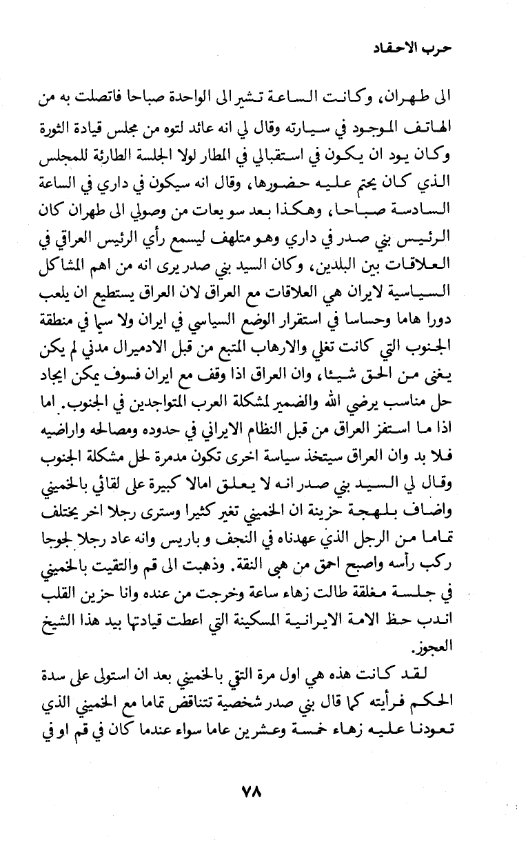 إلى طهران، وكانت الساعة تشير إلى الواحدة صباحا فاتصلت به من الهاتف الموجود في سيارته وقال لي انه عائد لتوه من مجلس قيادة الثورة وكان يود ان يكون في استقبالي في المطار لولا الجلسة الطارئة للمجلس الذي كان يحتم عليه حضورها، وقال انه سيكون في داري في الساعة السادسة صباحا، وهكذا بعد سويعات من وصولي إلى طهران كان الرئيس بني صدر في داري وهو متلهف ليسمع رأي الرئيس العراقي في العلاقات بين البلدين، وكان السيد بني صدر يرى انه من اهم المشاكل السياسية لايران هي العلاقات مع العراق لان العراق يستطيع ان يلعب دورا هاما وحساسا في استقرار الوضع السياسي في ايران ولاسيما في منطقة الجنوب التي كانت تغلي والارهاب المتبع من قبل الادميرال مدني لم يكن يغنى من الحق شيئا، وان العراق اذا وقف مع ايران فسوف يمكن ايجاد حل مناسب يرضي الله والضمير لمشكلة العرب المتواجدين في الجنوب. اما اذا ما استفز العراق من قبل النظام الايراني في حدوده ومصالحه واراضيه فلا بد وان العراق سيتخذ سياسة اخرى تكون مدمرة لحل مشكلة الجنوب وقال لي السيد بني صدر انه لا يعلق امالا كبيرة على لقائي بالخميني واضاف بلهجة حزينة ان الخميني تغير كثيرا وسترى رجلا اخر يختلف تماما من الرجل الذي عهدناه في النجف وباريس وانه عاد رجلا لجوجا ركب رأسه واصبح احمق من هي النقة. وذهبت إلى قم والتقيت بالخميني في جلسة مغلقة طالت زهاء ساعة وخرجت من عنده وانا حزين القلب اندب حظ الامة الايرانية المسكينة التي اعطت قيادتها بيد هذا الشيخ العجوز.