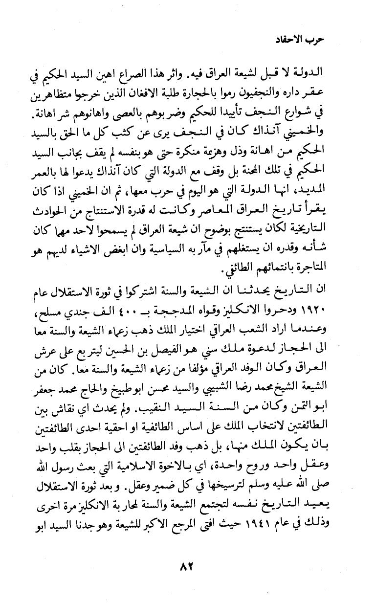 الدولة لاقبل لشيعة العراق فيه. واثر هذا الصراع اهين السيد الحكسم في عقر داره والنجفيون رموا بالحجارة طلبة الافغان الذين خرجوا متظاهرين في شوارع النجف تأييدا للحكيم وضربوهم بالعصى واهانوهم شر اهانة. والخميني آنذاك كان في النجف يرى عن كثب كل ما الحق بالسيد الحكيم من اهانة وذل وهزيمة منكرة حتى هو بنفسه لم يقف بجانب السيد الحكيم في تلك المحنة بل وقف مع الدولة التي كان آنذاك يدعوا لها بالعمر المديد، انها الدولة التي هو اليوم في حرب معها، ثم ان الخميني اذا كان يقرأ تاريخ العراق المعاصر وكانت له قدرة الاستنتاج من الحوادث التاريخية لكان يستنتج بوضوح ان شيعة العراق لم يسمحوا لاحد مهما كان شأنه وقدره ان يستغلهم في مآربه السياسية وان ابغض الاشياء لديهم هو المتاجرة بانتمائهم الطائفي.