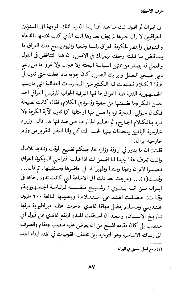 قلت: ان مايدور في اروقة وزارة خارجيتكم تضييع للوقت وتبديد للامال وانت تعرف هذا جيدا انا اضمن لك اذا قبلت اقتراحي ان يكون العراق نصيرا لايران وعونا وسندا وظهيرا لها في حاضرها ومستقبلها. ثم قال ... وقلت (¬1) ... وعرجت بعد ذلك إلى الاشاعة التي كانت تدور رحاها في ايران من انه ينوي ترشيح نفسه لرئاسة الجمهورية، وقلت: حصلت الهند على استقلالها وبنفوسها البالغة 600 مليون هندوسي ومسلم بفضل مهاتما غاندي دحرت اعظم امبراطورية عرفها تاريخ الانسان، وبعد ان استقلت الهند، ارتفع غاندي عن قبول أي منصب بل كان مقامه اشمخ من ان يعرض عليه منصب ومقام وانصرف إلى رسالته الاساسية وهو التوحيد بين مختلف القوميات في الهند لبناء الهند