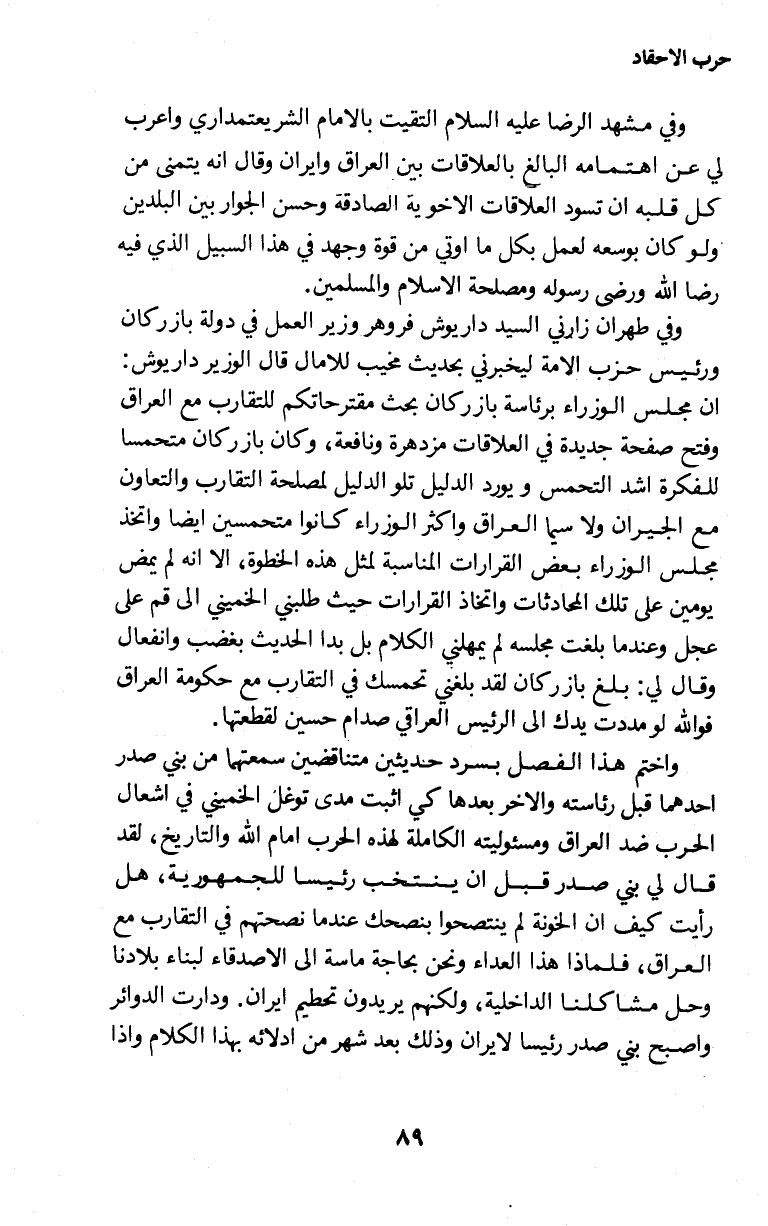 وفي طهران زارني السيد داريوش فروهر وزير العمل في دولة بازركان ورئيس حزب الامة ليخبرني بحديث مخيب للامال قال الوزير داريوش: ان مجلس الوزراء برئاسة بازركان بحث مقترحاتكم للتقارب مع العراق وفتح صفحة جديدة في العلاقات مزدهرة ونافعة، وكان بازركان متحمسا للفكرة اشد التحمس ويورد الدليل تلو الدليل لمصلحة التقارب والتعاون مع الجيران ولا سيما العراق واكثر الوزراء كانوا متحمسين ايضا واتخذ مجلس الوزراء بعض القرارات المناسبة لمثل هذه الخطوة، الا انه لم يمض يومين على تلك المحادثات واتخاذ القرارات حيث طلبني الخميني إلى قم على عجل وعندما بلغت مجلسه لم يمهلني الكلام بل بدا الحديث بغضب انفعال وقال لي: بلغ بازركان لقد بلغني تحمسك في التقارب مع حكومة العراق فوالله لو مددت يدك إلى الرئيس العراقي صدام حسين لقطعتها.