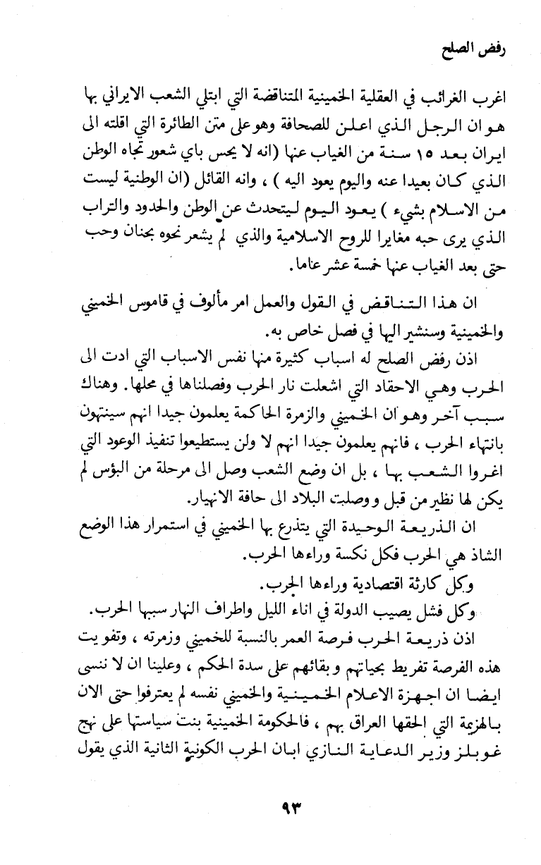 ان الذريعة الوحيدة التي يتذرع بها الخميني في استمرار هذا الوضع الشاذ هي الحرب فكل نكسة وراءها الحرب.