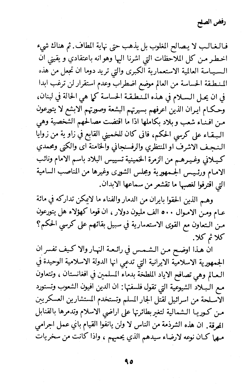 فالغالب لايصالح بل يذهب حتى نهاية المطاف. ثم هناك شيء اخطر من كل الملاحظات التي اشرنا اليها وهو انه باعتقادي ويقيني ان السياسة العالمية الاستعمارية الكبرى والتي تريد دوما ان تجعل من هذه المنطقة الحساسة من العالم موضع اضطراب وعدم استقرار لن ترغب ابدا في ان يحل السلام في هذه المنطقة الحساسة كما هي الحالة في لبنان، وحكام ايران الذين اعرفهم بسيرتهم البشعة وصورتهم الابشع لا يتورعون من افناء شعب وبلاد بكاملها اذا ما اقتضت مصالحهم الشخصية وهي البقاء على كرسي الحكم، فانى كان للخميني القابع في زاوية من زوايا النجف الاشرف او المنتظري والرفسنجاني والخامنة اى والكنى ومحمدي كيلاني وغيرهم من الزمرة الخمينية تسييس البلاد باسم الامام ونائب الامام ورئيس الجمهورية ومجلس الشورى وغيرها من المناصب السامية التي اقترفوا لغصبها ما تقشعر من سماعها الابدان.