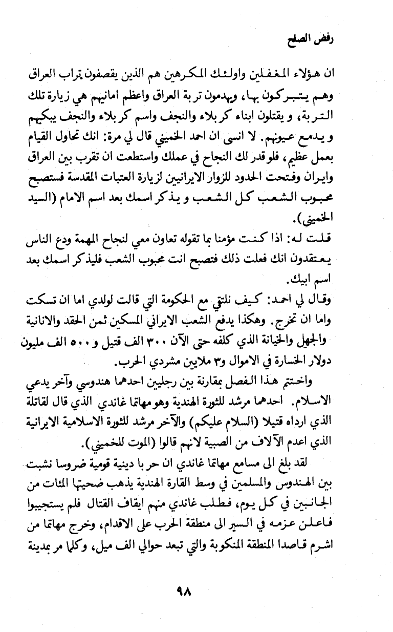 ان هؤلاء المغفلين واولئك المكرهين هم الذين يقصفون تراب العراق وهم يتبركون بها، ويهدمون تربة العراق واعظم امانيهم هي زيارة تلك التربة، ويقتلون ابناء كربلاء والنجف واسم كربلاء والنجف يبكيهم ويدمع عيونهم. لا انسى ان احمد الخميني قال لي مرة: انك تحاول القيام بعمل عظيم، فلو قدر لك النجاح في عملك واستطعت ان تقرب بين العراق وايران وفتحت الحدود للزوار الايرانيين لزيارة العتبات المقدسة فستصبح محبوب الشعب كل الشعب ويذكر اسمك بعد اسم الامام (السيد الخميني).