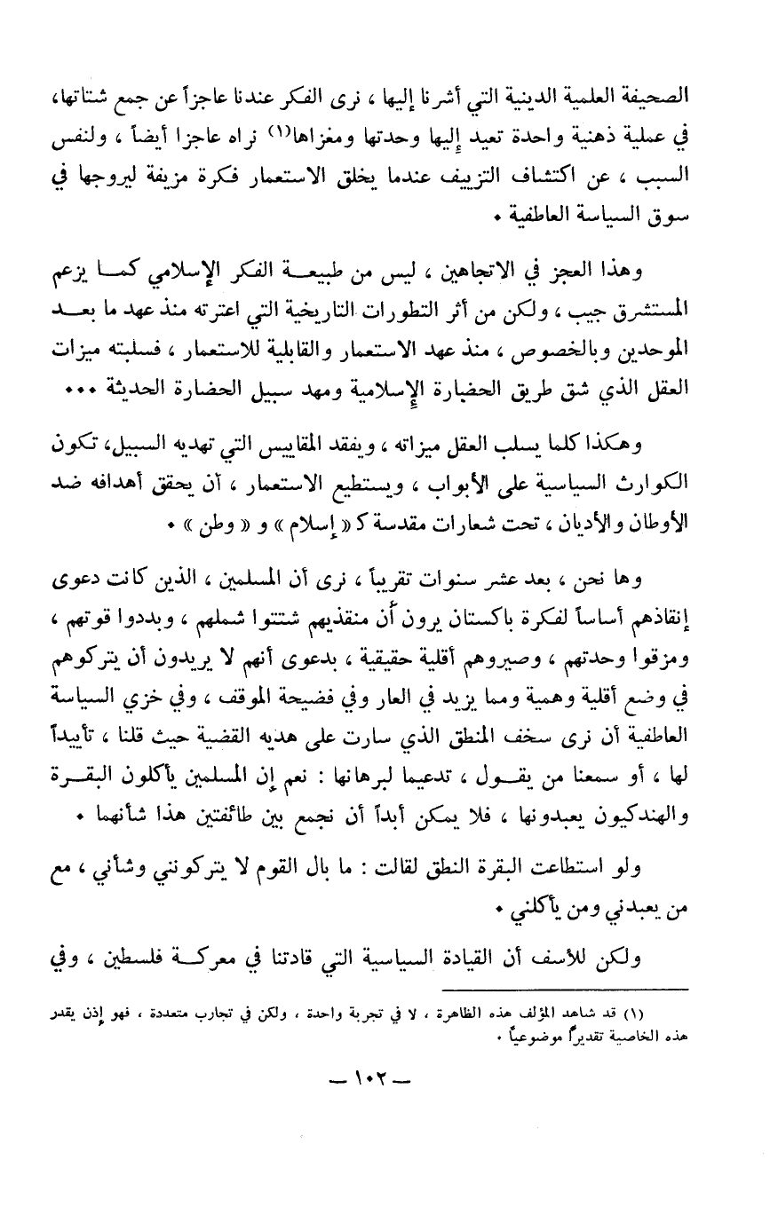 ليس في إمكان أي مؤرخ اجتماعي أن يقدر تقديراً صائباً الكارثة التي حلت بالعالم الإسلامي، يوم تأسست دولة باكستان، ولكن نستطيع من الآن أن نقول إنها غيرت مجرى تاريخ الإسلام في آسيا لعدة قرون، وحينما نحلل هذه الكارثة بصفتها حادثاً سياسياً يتصل بطبيعة الحال بطريقة تفكير معينة، نرى أن فكرة (باكستان) هي أبرز صورة تظهر فيها النزعة (الذرية) بكل وضوح.
