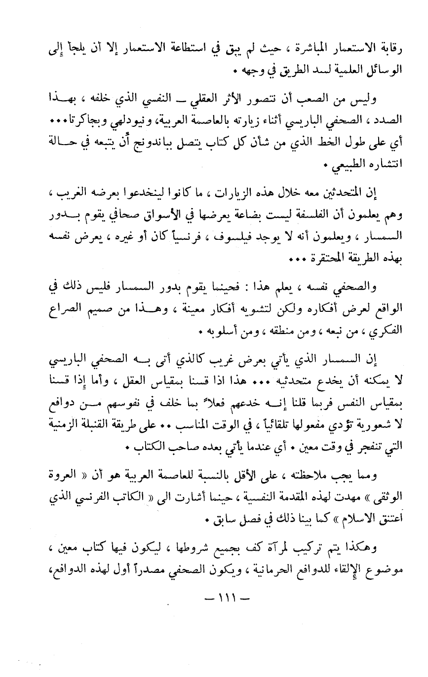 وفي كلتا الحالتين يهدف الاستعمار، بالوسائل المناسبة إلى فصل البلد المستعمَر عن بعض الأفكار، فإذا كانت منبعثة من الداخل، فمن الميسور لديه أن يستخدم وسائل الضغط والإرهاب مع من دخل المعركة تحت رايتها، أما إذا كانت آتية من الخارج، أي إذا كان صاحبها قد أفلت من نفوذ الاستعمار المباشر، فسيكون الاستعمار مضطراً إلى التكيف مع الظروف الجديدة في الصراع الفكري، وإلى استخدام الوسائل العلمية التي أشرنا إليها عندما وصفنا صنفين من (مرآة الحرمان) في الفصول السابقة.
