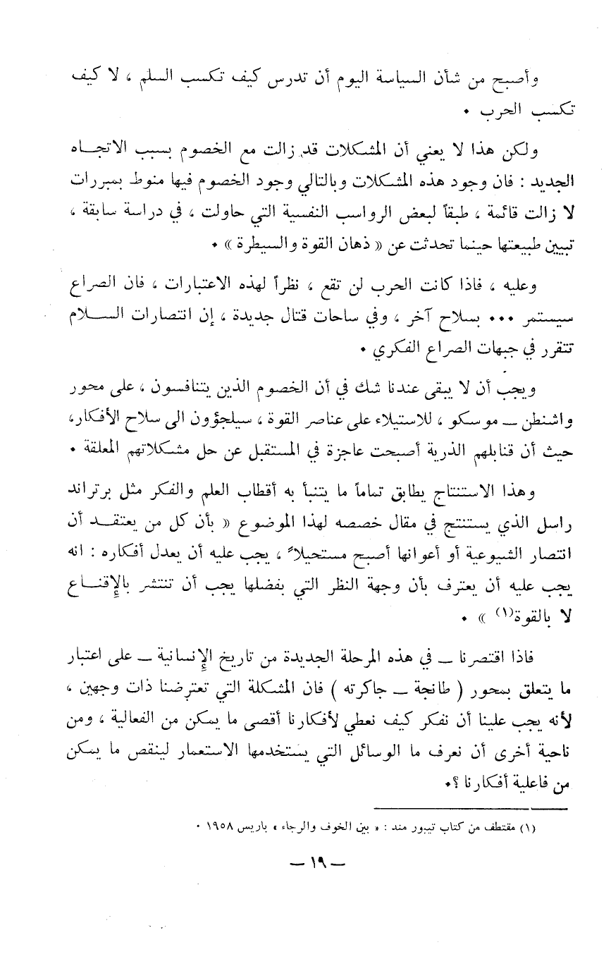 فإذا اقتصرنا- في هذه المرحلة الجديدة من تاريخ الإنسانية- على اعتبار ما يتعلق بمحور (طنجة- جاكرتا) فإن المشكلة التي تعترضنا ذات وجهين، لأنه يجب علينا أن نفكر كيف نعطي لأفكارنا أقصى ما يمكن من الفعالية، ومن ناحية أخرى أن نعرف ما الوسائل التي يستخدمها الاستعمار لينقص ما يمكن من فاعملية أفكارنا؟.