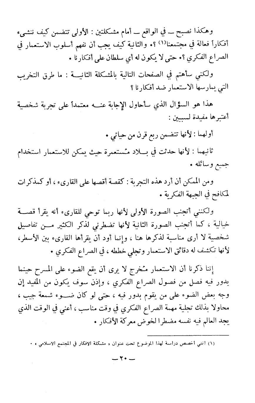 خيالية، كما أتجنب الصورة الثانية لأنها تضطرني لذكر الكثير من تفاصيل شخصية، لا أرى مناسبة لذكرها هنا، وإنما أود أن يقرأها القارئ بين الأسطر، لأنها تكشف له دقائق الاستعمار وتجلي خططه، في الصراع الفكري.