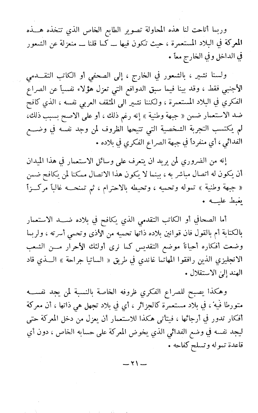 إن ظروف البلاد المستعمَرة لم تترك لمن يدخل الصراع الفكري أن يختار، ولو قدرنا أنه قد اختار هو نفسه، هذا النوع من الكفاح، لكان في تقديرنا نوع من الاعتساف، لأننا نكون قد اتهمناه، بمقدار من البلادة لا يتصوره العقل أو بمقدار من البطولة لا يدعيه لنفسه.