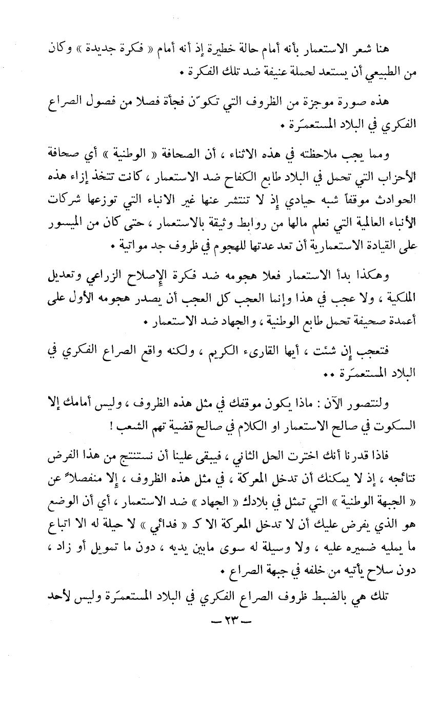 تلك هي بالضبط ظروف الصراع الفكري في البلاد المستعمَرة، وليس لأحد أن يختار سوى أن يستمر فيه على هذه الشروط، أو أن يخرج من الميدان.
