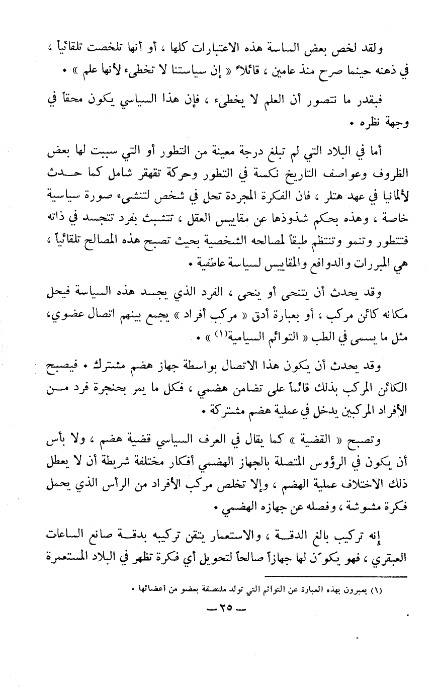 إنه تركيب بالغ الدقة، والاستعمار يتقن تركيبه بدقة صانع الساعات العبقري، فهو يكوّن لها جهازاً صالحاً لتحويل أي فكرة تظهر في البلاد المستعمرة إلى فكرة (متجسدة) قريبة المنال، ويكون له بالتالي خير وسيلة لمقاومة أي محاولة، تظهر في البلاد المستعمَرة لتعديل وتصحيح نظمها السياسية.
