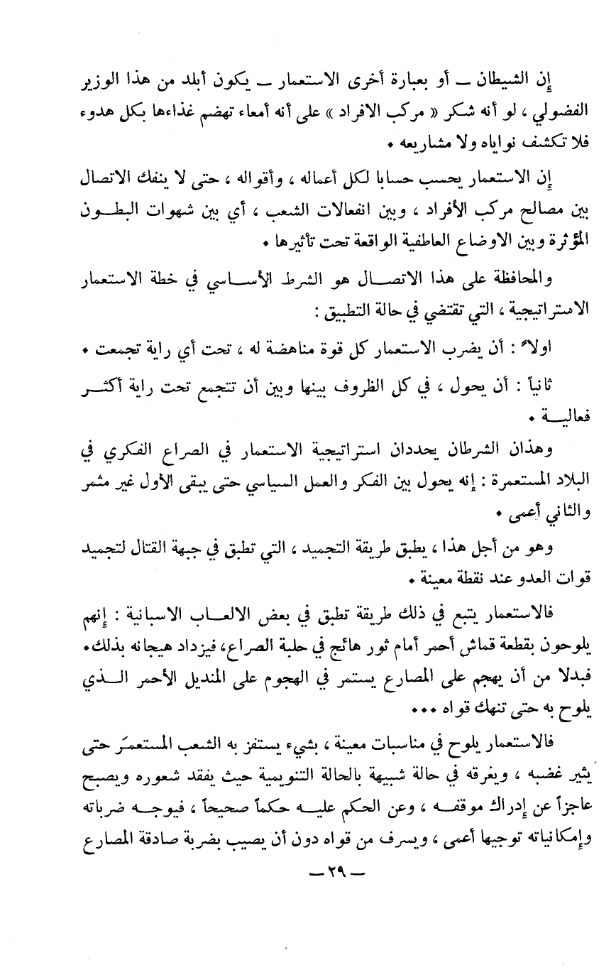 إن الاستعمار يحسب حساباً لكل أعماله وأقواله، حتى لا ينفك الاتصال بين مصالح مركب الأفراد، وبين انفعالات الشعب، أي بين شهوات البطون المؤثرة وبين الأوضاع العاطفية الواقعة تحت تأثيرها.
