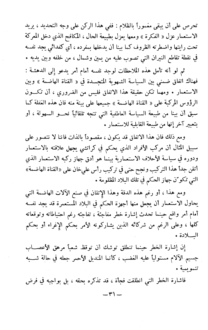 ومع هذا، أو على الرغم من هذه الدقة وهذا الإتقان في صنع الآلات الهاضمة، التي يحاول الاستعمار أن يجعل منها أجهزة الحكم في البلاد المستعمرة، قد يجد نفسه أمام أمر واقع، تحدث إشارة خطر مفاجئة، تفاجئه على الرغم من احتياطاته وتوقعاته كلها، وعلى الرغم من شركائه الذين يشاركونه الأمر بحكم الإغراء أو بحكم البلادة.