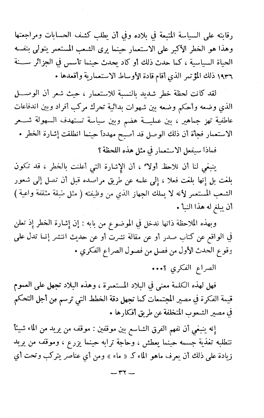 فإشارة الخطر التي انطلقت فجأة، قد تذكره بحقه، بل بواجبه في فرض رقابته على السياسة المتبعة في بلاده وفي أن يطلب كشف الحسابات ومراجعتها، وهذا هو الخطر الأكبر على الاستعمار، حينما يرى الشعب المستعمر يتولى بنفسه الحياة السياسية، كما حدث ذلك أو كاد يحدث حينما تأسس في الجزائر سنة 1936م، ذلك المؤتمر الذي أقام قادة الأوساط الاستعمار ية وأقعدها.