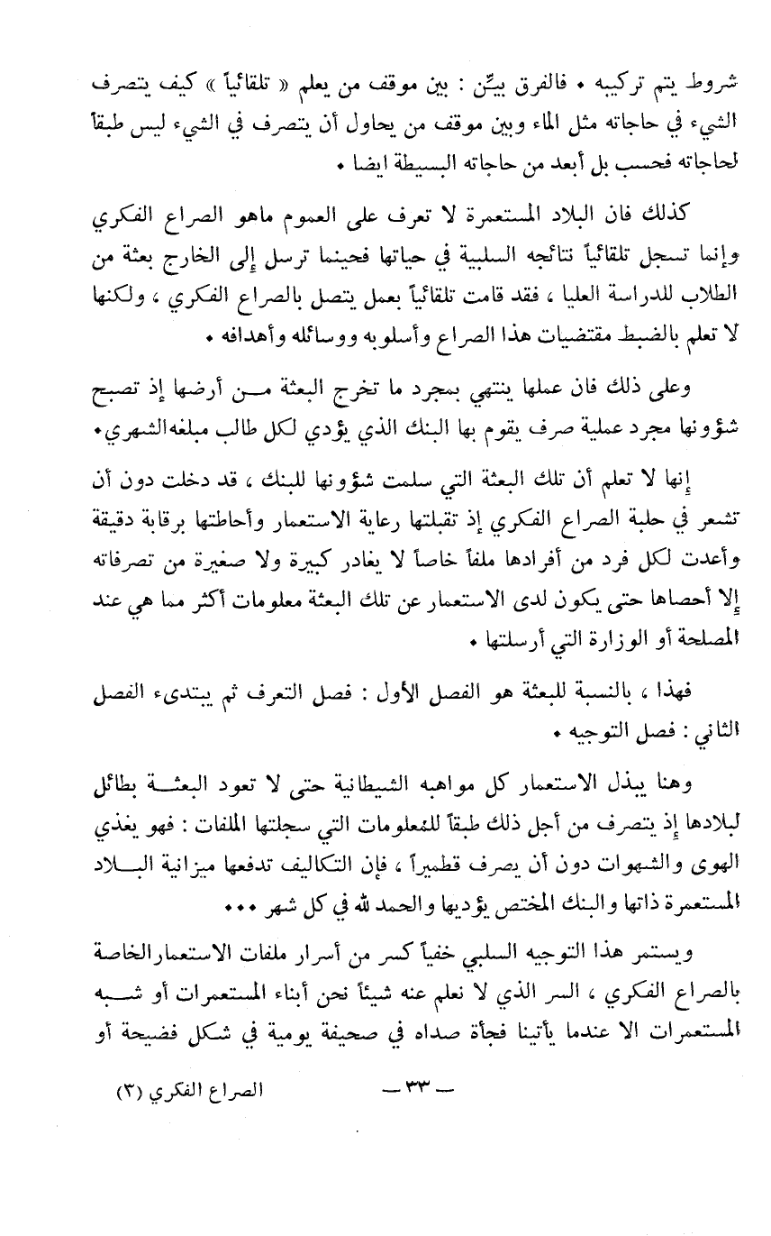 كذلك فإن البلاد المستعمرة لا تعرف عموماً ما هو الصراع الفكري، وإنما تسجل تلقائياً نتائجه السلبية في حياتها، فحينما ترسل إلى الخارج بعثة من الطلاب للدراسة العليا، فقد قام تلقائياً بعمل يتصل بالصراع الفكري، ولكنها لا تعلم بالضبط مقتضيات هذا الصراع وأسلوبه ووسائله وأهدافه.
