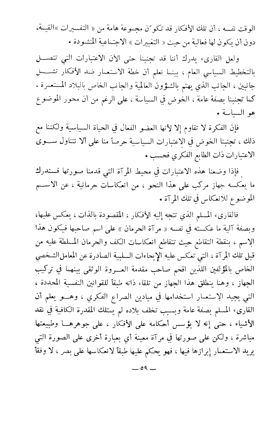 وإذن فلا غرابة أن يستغل الاستعمار رجلاً طيباً، دون علمه، ليقحم اسمي في (مرآة) مكونة من العناصر التي ذكرناها، أي من اسم (العروة الوثقى)، الذي يمثل- بسبب الهالة التي يحيطه بها تاريخ الإسلام الحديث- المرآة العاكسة في أجلى صورها، ثم اسمي الكاتبين الكبيرين، باعتبارهما مصباحين نفسيين. ليسلطا على موضوع الانعكاس الأضواء المناسبة، ثم اسم صاحب المقدمة الطيّب القلب بصفته ضماناً أدبياً يبعد الشكوك عن المرآة.