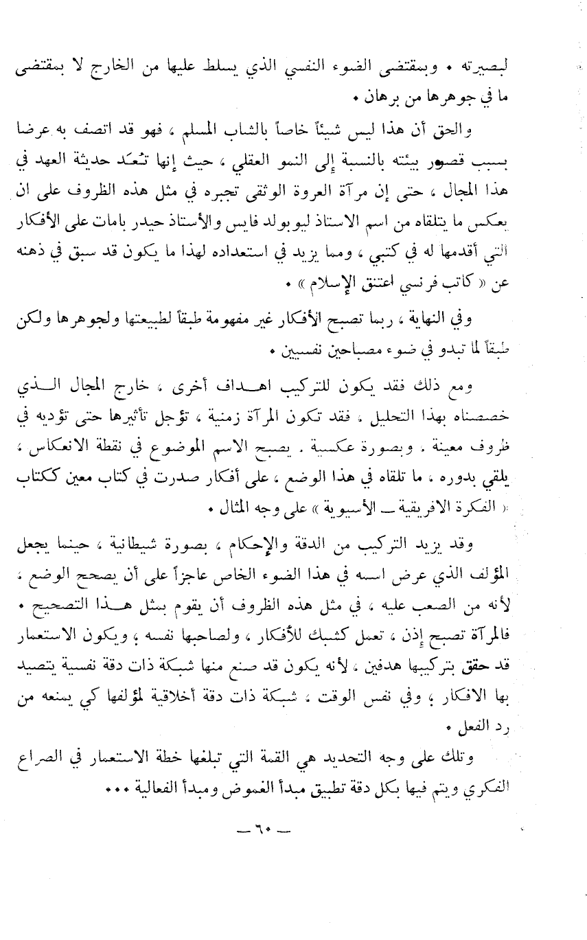 وبعبارة أخرى لا يمكن لكتابات الأستاذ ليوبولد فايس أن تقدم للوسط الإسلامي مطالب (تغييرات) معينة في منهج حياته، أي أن تقدم له نظرية تقتضي تعديلاً في السلوك الجماعي، ولا دخل لإرادته في هذا الأمر، بل لعله يحدث بصفة لا شعورية تماماً.