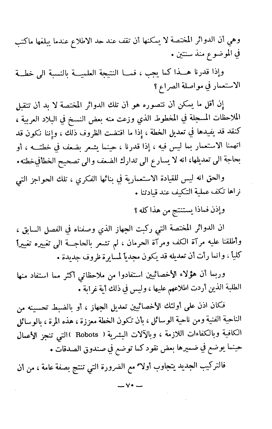 وإنه لمن لغو الحديث أن نقول إن الاستعمار يعلم هذا الوضع الشاذ في سلوكنا، ويرى فيه أحسن مشجع لعزلنا عن المجتمع العام، كما يعزل مكافح الصراع الفكري عن المجتمع الخاص، إذ يعزلنا فعلاً عن عالم نتهمه ويتهمنا، ويملأ