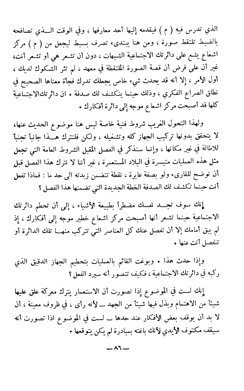 فإذا كان أي خلل أخلاقي في الدائرة الشخصية فإنه يكون أيسر من لعب الصبيان بالنسبة إلى القائم بهذه العمليات، أن يلقي ما يريد من الظلام على دائرة الأفكار في البلاد التي تفقد فيها الأفكار نورها الذاتي، وذلك لأنه يستعين بالشبهات التي يمكنه في هذه الحالة خلقها بكل سهولة في الدائرة الاجتماعية.