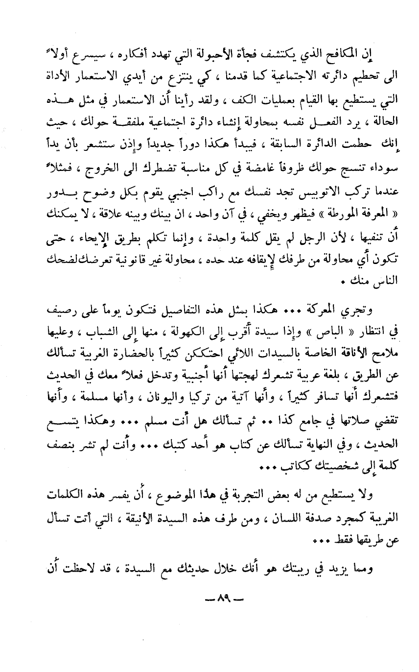 ولنفرض بعد هذا أنك تعرف جيداً العنصر (م) وإلى حد ما العنصر (ط)، حتى إنه لا يتطرق إلى ذهنك بسببهما شيء من الريب، ولكنك ليس لديك عن العناصر (ج ف ب د) المعلومات الكافية، بينما مراصد الاستعمار تعلم عنهم كل شيء كما تعلم جهلك أحوالهم.