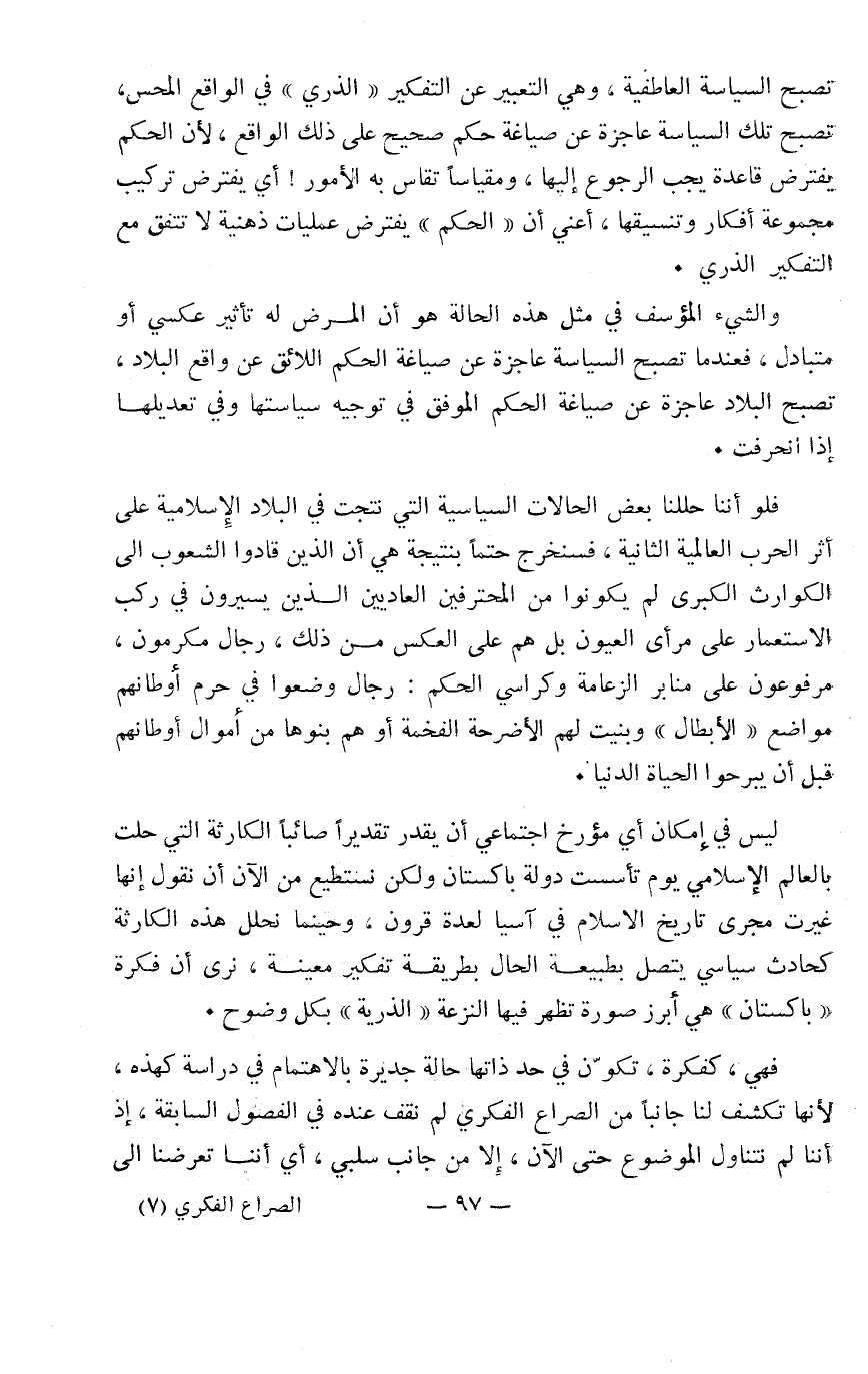 هذه هي الصورة العامة لتجربة معينة خصصنا لها هذا الفصل، كي نبين للقارئ أن الصراع الفكري في البلاد المستعمرة، يجدد بجانب من جوانبه وبصورة ما، الأسطورة الشهيرة التي يصف فيها أفلاطون، بطريقة رمزية الحالة الغريبة التي يكون عليها بعض الناس، حينما يتصورون الواقع، حسبها يصور لهم لا طبقاً لحقيقته؛ فهم يعيشون في نظر الفيلسوف العتيق، في قعر غار، ملتفتين إلى جدرانه قهراً، فلا يرون سوى الأشباح المتحركة عليه دون أن يفكروا أنها الأشخاص يأتون ويذهبون وراء ظهورهم، وأن ناراً أوقدت بين باب الغار وأولئك الأشخاص هي التي تلقي ظلهم في صورة أشباح متحركة على الجدران، ودون أن يشعروا خاصة، أن الحقيقة ليست في تلك الصور الوهمية، ولا في النار التي تصورها لأبصارهم المسحورة، بل هي خارج الغار، في ضوء النهار، تحت الشمس الساطعة ...