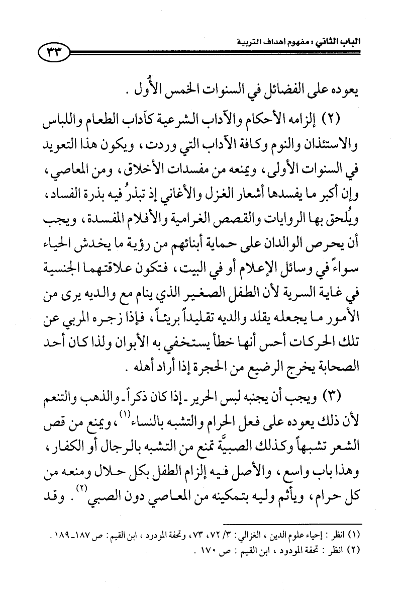 (2) إلزامه الأحكام والآداب الشرعية كآداب الطعام واللباس والاستئذان والنوم وكافة الآداب التي وردت، ويكون هذا التعويد في السنوات الأولى، ويمنعه من مفسدات الأخلاق، ومن المعاصي، وإن أكبر ما يفسدها أشعار الغزل والأغاني إذ تبذرُ فيه بذرة الفساد، ويُلحق بها الروايات والقصص الغرامية والأفلام المفسدة، ويجب أن يحرص الوالدان على حماية أبنائهم من رؤية ما يخدش الحياء سواءً في وسائل الإعلام أو في البيت، فتكون علاقتهما الجنسية في غاية السرية لأن الطفل الصغير الذي ينام مع والديه يرى من الأمور ما يجعله يقلد والديه تقليداً بريئاً، فإذا زجره المربي عن تلك الحركات أحس أنها خطأ يستخفي به الأبوان ولذا كان أحد الصحابة يخرج الرضيع من الحجرة إذا أراد أهله.