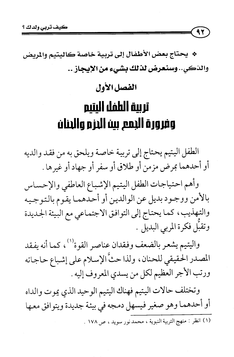 وضرورة الجمع بين الحزم والحنان الطفل اليتيم يحتاج إلى تربية خاصة ويلحق به من فقد والديه أو أحدهما بمرض مزمن أو طلاق أو سفر أو جهاد أو غيرها.