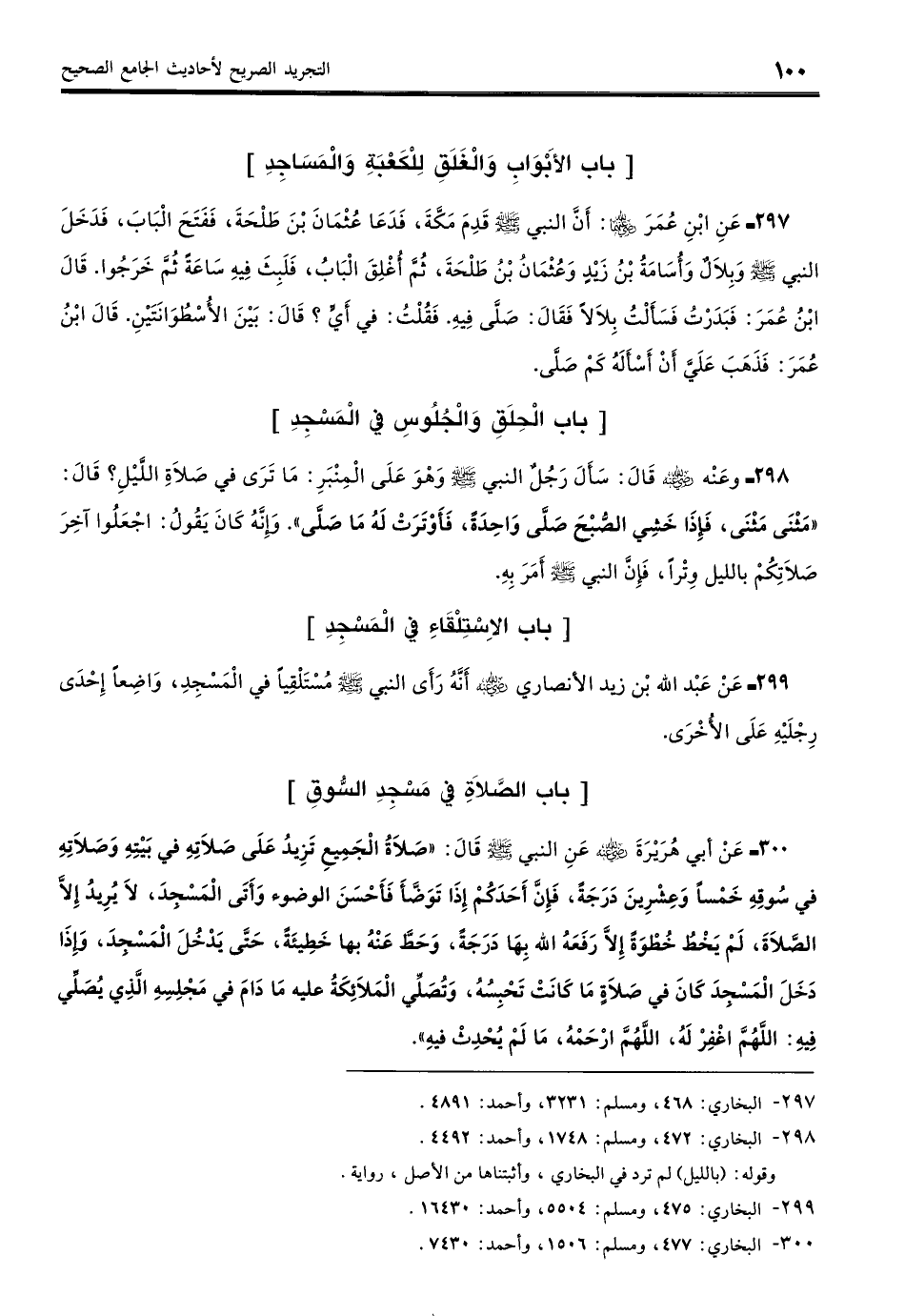 297 - عَنِ ابْنِ عُمَرَ - رضي الله عنهما -: أَنَّ النَّبِيَّ - صلى الله عليه وسلم - قَدِمَ مَكَّةَ، فَدَعَا عُثمَانَ بْنَ طَلْحَةَ فَفَتَحَ الْبَابَ فَدَخَلَ النَّبِيُّ - صلى الله عليه وسلم - وَبِلالٌ وَأُسَامَةُ بْنُ زَيْدٍ وَعُثمَانُ بْنُ طَلْحَةَ، ثمَّ أَغْلَقَ الْبَابَ، فَلَبِث فِيهِ سَاعَةً ثمَّ خَرَجُوا، قَالَ ابْنُ عُمَرَ: فَبَدَرْتُ فَسَأَلْتُ بِلالا، فَقَالَ: صَلَّى فِيهِ، فَقُلْتُ: فِي أَيٍّ؟ قَالَ: بَيْنَ الأُسْطُوَانَتَيْنِ، قَالَ ابْنُ عُمَرَ: فَذَهَبَ عَلَيَّ أَنْ أَسْأَلَهُ كَمْ صَلَّى. (بخاري: 468)