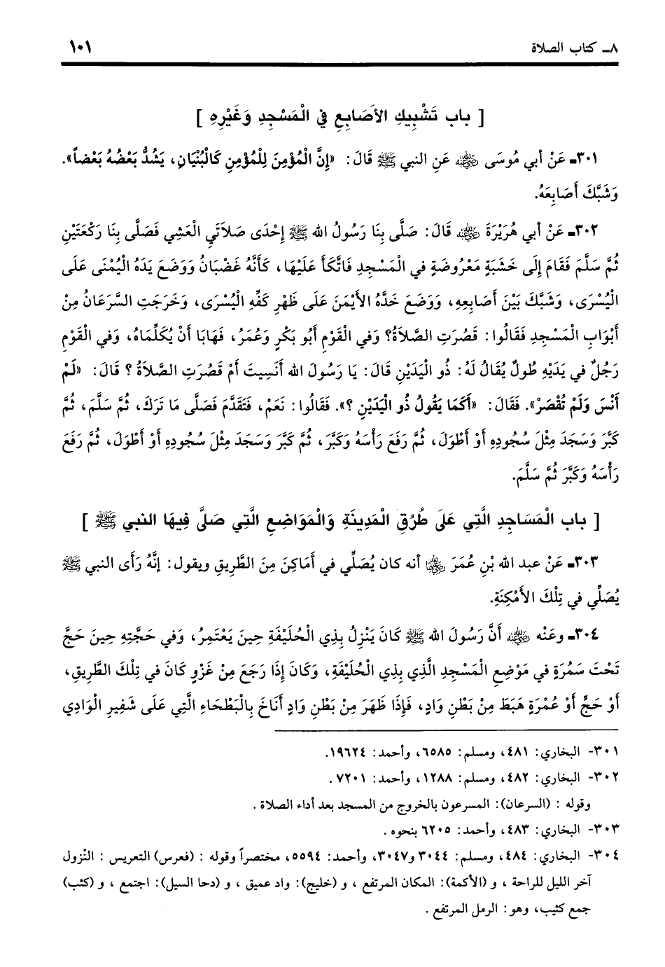 302 - عَنْ أَبِي هُرَيْرَةَ - رضي الله عنه - قَالَ: صَلَّى بِنَا رَسُولُ اللَّهِ - صلى الله عليه وسلم - إِحْدَى صَلاتَيِ الْعَشِيِّ، فَصَلَّى بِنَا رَكْعَتَيْنِ ثمَّ سَلَّمَ، فَقَامَ إِلَى خَشَبَةٍ مَعْرُوضَةٍ فِي الْمَسْجِدِ فَاتَّكَأَ عَلَيْهَا كَأَنَّه غَضْبَانُ وَوَضَعَ يَدَهُ الْيُمْنَى عَلَى الْيُسْرَى وَشَبَّكَ بَيْنَ أَصَابِعِهِ وَوَضَعَ خَدَّهُ الأيْمَنَ عَلَى ظَهْرِ كَفِّهِ الْيُسْرَى وَخَرَجَتِ السَّرَعَانُ مِنْ أَبْوَابِ الْمَسْجِدِ، فَقَالُوا: قَصُرَتِ الصَّلاةُ؟ وَفِي الْقَوْمِ أَبُو بَكْرٍ وَعُمَرُ، فَهَابَا أَنْ يُكَلِّمَاهُ، وَفِي الْقَوْمِ رَجُلٌ فِي يَدَيْهِ طُولٌ يُقَالُ لَهُ ذُو الْيَدَيْنِ، قَالَ: يَا رَسُولَ اللَّهِ، أَنَسِيتَ أَمْ قَصُرَتِ الصَّلاةُ؟ قَالَ: «لَمْ أَنْسَ وَلَمْ تُقْصَرْ» فَقَالَ: «أَكَمَا يَقُولُ ذُو الْيَدَيْنِ؟» فَقَالُوا: نَعَمْ. فَتَقَدَّمَ فَصَلَّى مَا تَرَكَ ثمَّ سَلَّمَ ثمَّ كَبَّرَ وَسَجَدَ مِثلَ سُجُودِهِ أَوْ أَطْوَلَ ثمَّ رَفَعَ رَأْسَهُ وَكَبَّرَ ثمَّ كَبَّرَ وَسَجَدَ مِثلَ سُجُودِهِ أَوْ أَطْوَلَ ثمَّ رَفَعَ رَأْسَهُ وَكَبَّرَ ثمَّ سَلَّمَ. (بخاري: 482)