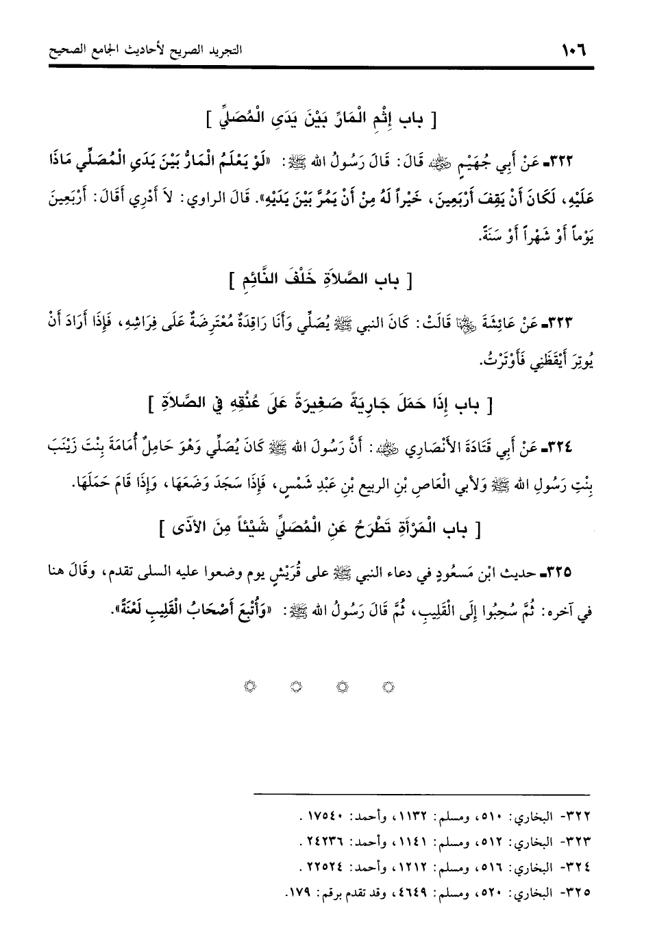 324 - عَنْ أَبِي قَتَادَةَ الأَنْصَارِيِّ - رضي الله عنه -: أَنَّ رَسُولَ اللَّهِ - صلى الله عليه وسلم - كَانَ يُصَلِّي وَهُوَ حَامِلٌ أُمَامَةَ بِنْتَ زَيْنَبَ بِنْتِ رَسُولِ اللَّهِ - صلى الله عليه وسلم - وَلأَبِي الْعَاصِ بْنِ رَبِيعَةَ بْنِ عَبْد شَمْسٍ، فَإِذَا سَجَدَ وَضَعَهَا وَإِذَا قَامَ حَمَلَهَا. (بخاري: 516)