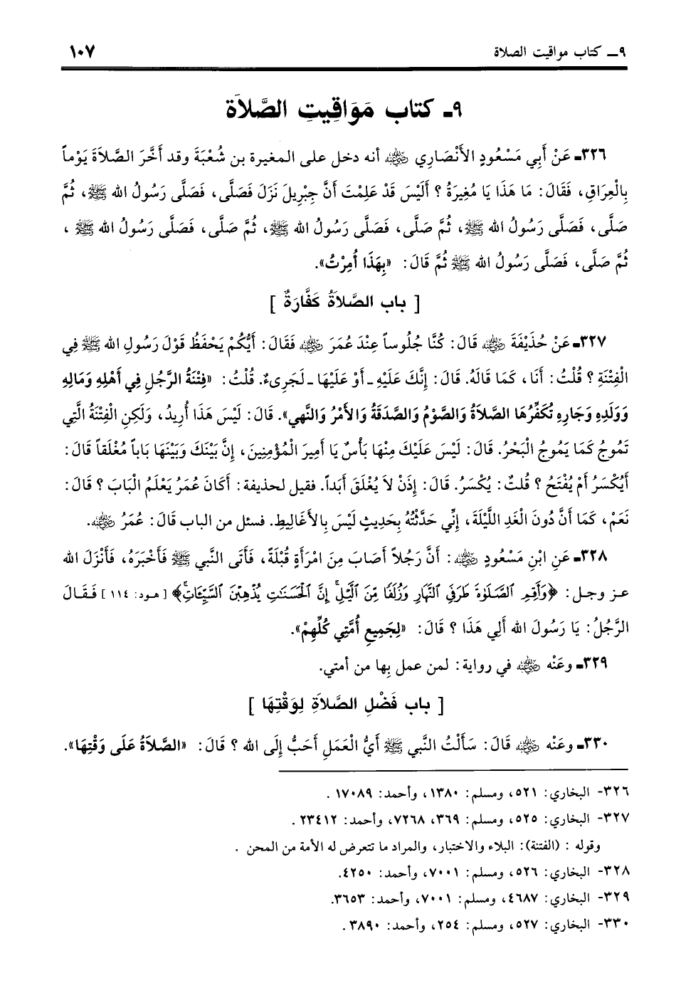 326 - عَنْ أَبِيْ مَسْعُودٍ الأَنْصَارِيِّ - رضي الله عنه -: أَنَّهُ دَخَلَ عَلَى المُغِيْرَةِ بْنِ شُعْبَةَ وَقَدْ أَخَّرَ الصَّلاةَ يَوْمًا وَهُوَ بِالْعَرَاقِ، فَقَالَ: مَا هَذَا يَا مُغِيرَةُ، أَلَيْسَ قَدْ عَلِمْتَ أَنَّ جِبْرِيلَ - صلى الله عليه وسلم - نَزَلَ فَصَلَّى فَصَلَّى رَسُولُ اللَّهِ - صلى الله عليه وسلم -، ثمَّ صَلَّى فَصَلَّى رَسُولُ اللَّهِ - صلى الله عليه وسلم -، ثمَّ صَلَّى فَصَلَّى رَسُولُ اللَّهِ - صلى الله عليه وسلم -، ثمَّ صَلَّى فَصَلَّى رَسُولُ اللَّهِ - صلى الله عليه وسلم -، ثمَّ صَلَّى فَصَلَّى رَسُولُ اللَّهِ - صلى الله عليه وسلم -، ثمَّ قَالَ: «بِهَذَا أُمِرْتُ». (بخاري: 521).