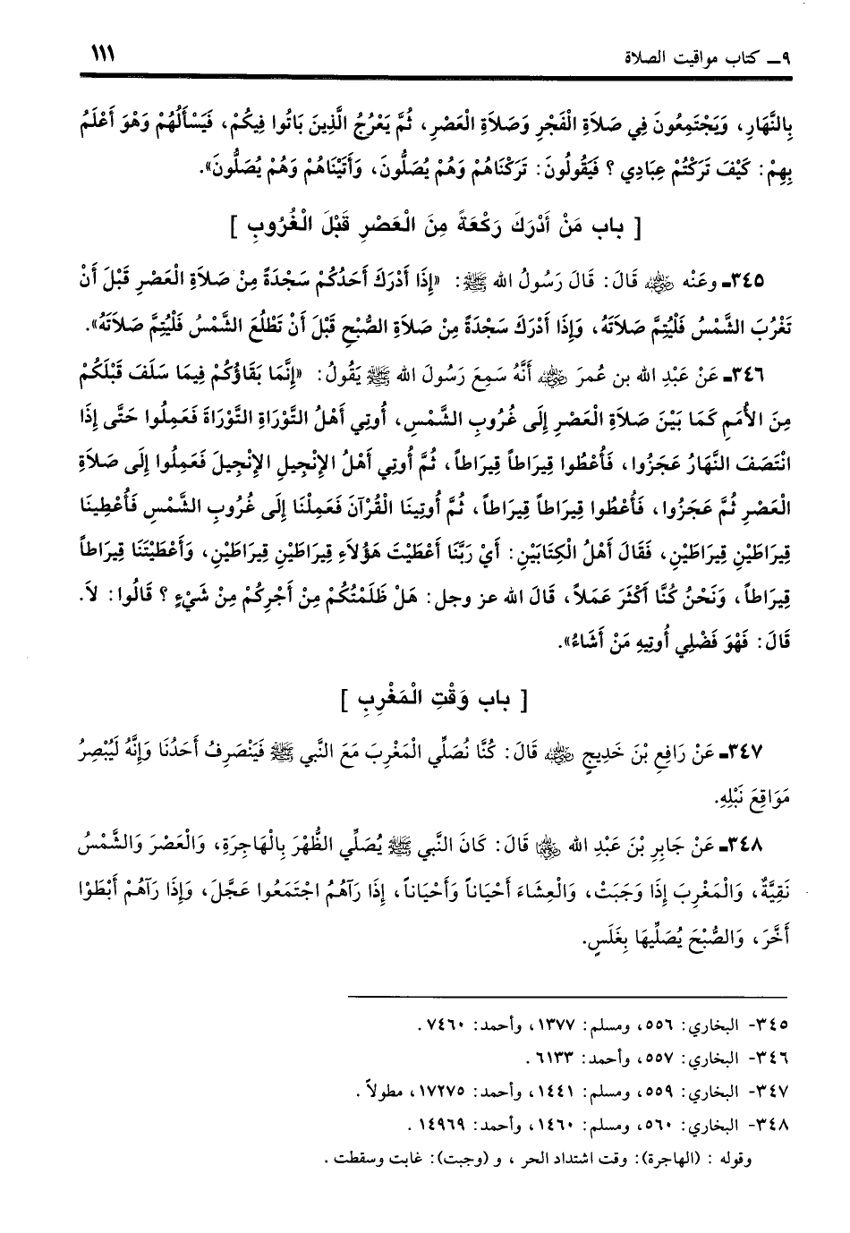 347 - عَنْ رَافِعِ بْنِ خَدِيجٍ - رضي الله عنه - يَقُولُ: كُنَّا نُصَلِّي الْمَغْرِبَ مَعَ النَّبِيِّ - صلى الله عليه وسلم - فَيَنْصَرِفُ أَحَدُنَا وَإِنَّهُ لَيُبْصِرُ مَوَاقِعَ نَبْلِهِ. (بخاري: 559)