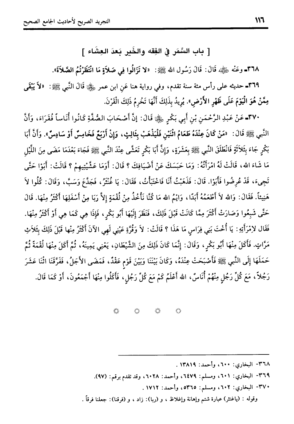 370 - عَنْ عَبْدِ الرَّحْمَنِ بْنِ أَبِي بَكْرٍ - رضي الله عنهما -: أَنَّ أَصْحَابَ الصُّفَّةِ كَانُوا أُنَاسًا فُقَرَاءَ وَأَنَّ النَّبِيَّ - صلى الله عليه وسلم - قَالَ: «مَنْ كَانَ عِنْدَهُ طَعَامُ اثنَيْنِ فَلْيَذْهَبْ بِثالِث، وَإِنْ أَرْبَعٌ فَخَامِسٌ أَوْ سَادِسٌ». وَأَنَّ أَبَا بَكْرٍ جَاءَ بِثلاثةٍ، فَانْطَلَقَ النَّبِيُّ - صلى الله عليه وسلم - بِعَشَرَةٍ، قَالَ: فَهُوَ أَنَا وَأَبِي وَأُمِّي، - فَلا أَدْرِي قَالَ: وَامْرَأَتِي - وَخَادِمٌ بَيْنَنَا وَبَيْنَ بَيْتِ أَبِي بَكْرٍ، وَإِنَّ أَبَا بَكْرٍ تَعَشَّى عِنْدَ النَّبِيِّ - صلى الله عليه وسلم -، ثمَّ لَبِثَ حَيْثُ صُلِّيَتِ الْعِشَاءُ ثمَّ رَجَعَ، فَلَبِثَ حَتَّى تَعَشَّى النَّبِيُّ - صلى الله عليه وسلم -، فَجَاءَ بَعْدَ مَا مَضَى مِنَ اللَّيْلِ مَا شَاءَ اللَّهُ، قَالَتْ لَهُ امْرَأَتُهُ: وَمَا حَبَسَكَ عَنْ أَضْيَافِكَ؟ أَوْ قَالَتْ: ضَيْفِكَ، قَالَ: أَوَمَا عَشَّيْتِيهِمْ؟ قَالَتْ: أَبَوْا حَتَّى تَجِيءَ، قَدْ عُرِضُوا فَأَبَوْا، قَالَ: فَذَهَبْتُ أَنَا فَاخْتَبَأْتُ، فَقَالَ: يَا غُنْثرُ، فَجَدَّعَ وَسَبَّ، وَقَالَ: كُلُوا لا هَنِيئًا، فَقَالَ: وَاللَّهِ لا أَطْعَمُهُ أَبَدًا، وَايْمُ اللَّهِ، مَا كُنَّا نَأْخُذُ مِنْ لُقْمَةٍ إِلا رَبَا مِنْ أَسْفَلِهَا أَكْثرُ مِنْهَا، قَالَ: يَعْنِي حَتَّى شَبِعُوا، وَصَارَتْ أَكْثرَ مِمَّا كَانَتْ قَبْلَ ذَلِكَ، فَنَظَرَ إِلَيْهَا أَبُو بَكْرٍ، فَإِذَا هِيَ كَمَا هِيَ أَوْ أَكْثرُ مِنْهَا، فَقَالَ لامْرَأَتِهِ: يَا أُخْتَ بَنِي فِرَاسٍ، مَا هَذَا؟ قَالَتْ: لا وَقُرَّةِ عَيْنِي، لَهِيَ الآنَ أَكْثرُ مِنْهَا قَبْلَ ذَلِكَ، بِثلاث مَرَّاتٍ، فَأَكَلَ مِنْهَا أَبُو بَكْرٍ وَقَالَ: إِنَّمَا كَانَ ذَلِكَ مِنَ الشَّيْطَانِ، يَعْنِي يَمِينَهُ، ثمَّ أَكَلَ مِنْهَا لُقْمَةً، ثمَّ حَمَلَهَا إِلَى النَّبِيِّ - صلى الله عليه وسلم - فَأَصْبَحَتْ عِنْدَهُ، وَكَانَ بَيْنَنَا وَبَيْنَ قَوْمٍ عَقْدٌ، فَمَضَى الأَجَلُ، فَفَرَّقَنَا اثْنَيْ عَشَرَ رَجُلًا، مَعَ كُلِّ رَجُلٍ مِنْهُمْ أُنَاسٌ، اللَّهُ أَعْلَمُ كَمْ مَعَ كُلِّ رَجُلٍ، فَأَكَلُوا مِنْهَا أَجْمَعُونَ. (بخاري: 602)