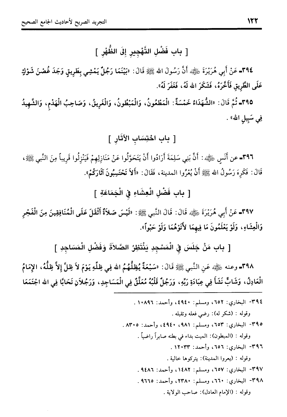 398 - عَنْ أَبِي هُرَيْرَةَ - رضي الله عنه -، عَنِ النَّبِيِّ - صلى الله عليه وسلم - قَالَ: «سَبْعَةٌ يُظِلُّهُمُ اللَّهُ فِي ظِلِّهِ يَوْمَ لا ظِلَّ إِلا ظِلُّهُ: الإِمَامُ الْعَادِلُ، وَشَابٌّ نَشَأَ فِي عِبَادَةِ رَبِّهِ، وَرَجُلٌ قَلْبُهُ مُعَلَّقٌ فِي الْمَسَاجِدِ، وَرَجُلانِ تَحَابَّا فِي اللَّهِ اجْتَمَعَا