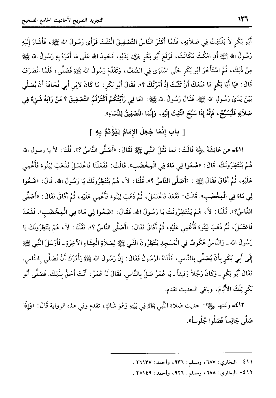 411 - عَنْ عَائِشَةَ - رضي الله عنها - قَالَتْ: لَمَّا ثَقُلَ النَّبِيُّ - صلى الله عليه وسلم - قَالَ: «أَصَلَّى النَّاسُ»؟ قُلْنَا: لا هُمْ يَنْتَظِرُونَكَ، قَالَ: «ضَعُوا لِي مَاءً فِي الْمِخْضَبِ». قَالَتْ: فَفَعَلْنَا، فَاغْتَسَلَ، فَذَهَبَ لِيَنُوءَ فَأُغْمِيَ عَلَيْهِ، ثُمَّ أَفَاقَ فَقَالَ - صلى الله عليه وسلم -: «أَصَلَّى النَّاسُ»؟ قُلْنَا: لا، هُمْ يَنْتَظِرُونَكَ يَا رَسُولَ اللَّهِ، قَالَ: «ضَعُوا لِي مَاءً فِي الْمِخْضَبِ». قَالَتْ: فَقَعَدَ فَاغْتَسَلَ، ثُمَّ ذَهَبَ لِيَنُوءَ فَأُغْمِيَ عَلَيْهِ، ثُمَّ أَفَاقَ فَقَالَ: «أَصَلَّى النَّاسُ»؟ قُلْنَا: لا، هُمْ يَنْتَظِرُونَكَ يَا رَسُولَ اللَّهِ، فَقَالَ: «ضَعُوا لِي مَاءً فِي الْمِخْضَبِ». فَقَعَدَ فَاغْتَسَلَ ثُمَّ ذَهَبَ لِيَنُوءَ فَأُغْمِيَ عَلَيْهِ، ثُمَّ أَفَاقَ فَقَالَ: «أَصَلَّى النَّاسُ»؟ فَقُلْنَا: لا، هُمْ يَنْتَظِرُونَكَ يَا رَسُولَ اللَّهِ، وَالنَّاسُ عُكُوفٌ فِي الْمَسْجِدِ يَنْتَظِرُونَ النَّبِيَّ - صلى الله عليه وسلم - لِصَلاةِ الْعِشَاءِ الآخِرَةِ، فَأَرْسَلَ النَّبِيُّ - صلى الله عليه وسلم - إِلَى أَبِي بَكْرٍ بِأَنْ يُصَلِّيَ بِالنَّاسِ، فَأَتَاهُ الرَّسُولُ فَقَالَ: إِنَّ رَسُولَ اللَّهِ - صلى الله عليه وسلم - يَأْمُرُكَ أَنْ تُصَلِّيَ بِالنَّاسِ، فَقَالَ أَبُو بَكْرٍ وَكَانَ رَجُلًا رَقِيقًا: يَا عُمَرُ، صَلِّ بِالنَّاسِ، فَقَالَ لَهُ عُمَرُ: أَنْتَ أَحَقُّ بِذَلِكَ، فَصَلَّى أَبُو بَكْرٍ تِلْكَ الايَّامَ. (بخاري: 687)