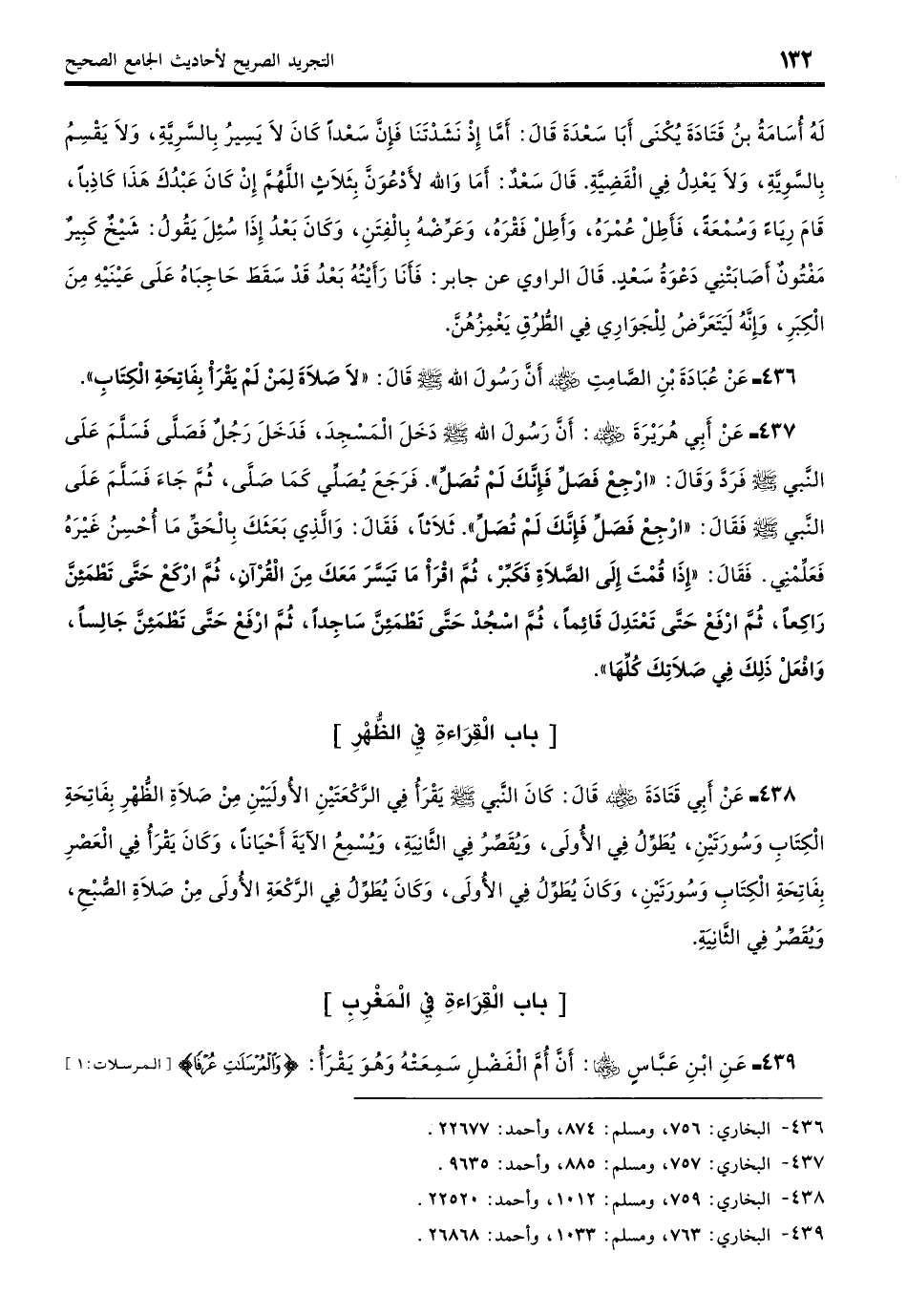 436 - عَنْ عُبَادَةَ بْنِ الصَّامِتِ - رضي الله عنه -: أَنَّ رَسُولَ اللَّهِ - صلى الله عليه وسلم - قَالَ: «لا صَلاةَ لِمَنْ لَمْ يَقْرَأْ بِفَاتِحَةِ الْكِتَابِ». (بخاري: 756)