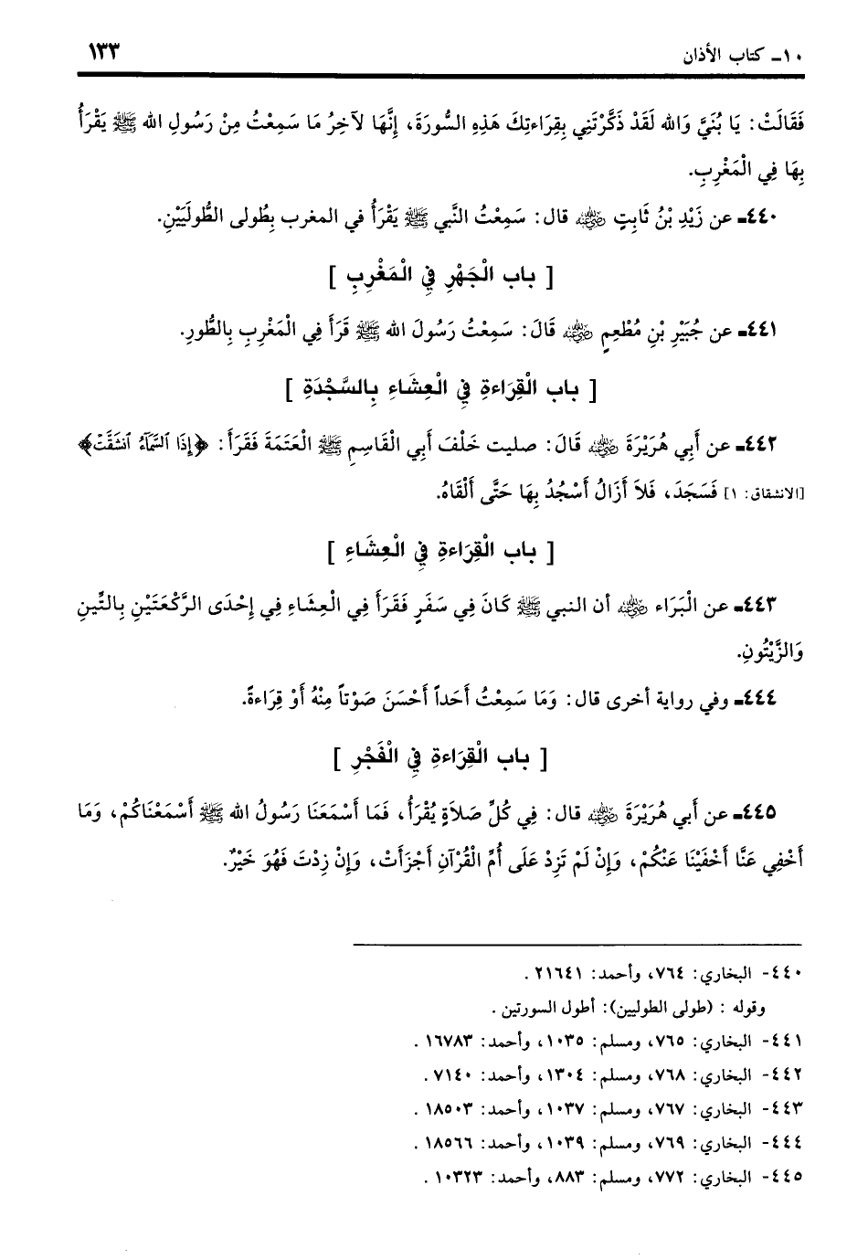 440 - عَنْ زَيْدِ بْنِ ثَابِتٍ - رضي الله عنه - قَالَ: قَدْ سَمِعْتُ النَّبِيَّ يَقْرَأُ فِي الْمَغْرِبِ - صلى الله عليه وسلم - بِطُولَى الطُّولَيَيْنِ. (بخاري: 764)
