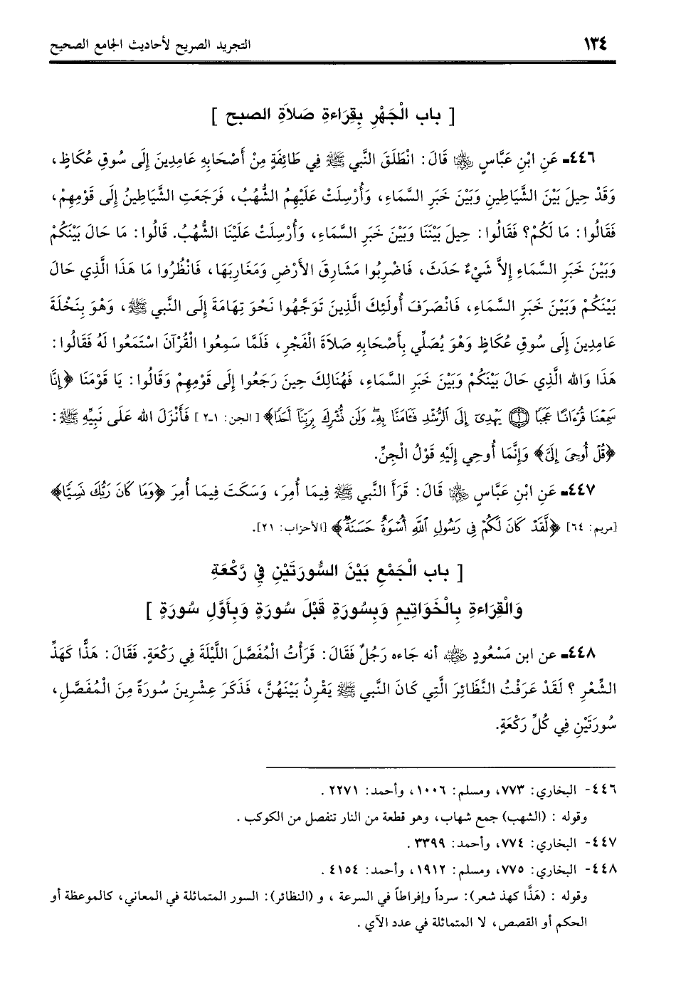 446 - عَنْ عَبيْدِاللَّهِ بْنِ عَبَّاسٍ - رضي الله عنهما - قَالَ: انْطَلَقَ النَّبِيُّ - صلى الله عليه وسلم - فِي طَائِفَةٍ مِنْ أَصْحَابِهِ عَامِدِينَ إِلَى سُوقِ عُكَاظٍ وَقَدْ حِيلَ بَيْنَ الشَّيَاطِينِ وَبَيْنَ خَبَرِ السَّمَاءِ وَأُرْسِلَتْ عَلَيْهِمُ الشُّهُبُ، فَرَجَعَتِ الشَّيَاطِينُ إِلَى قَوْمِهِمْ فَقَالُوا: مَا لَكُمْ؟ فَقَالُوا: حِيلَ بَيْنَنَا وَبَيْنَ خَبَرِ السَّمَاءِ وَأُرْسِلَتْ عَلَيْنَا الشُّهُبُ، قَالُوا: مَا حَالَ بَيْنَكُمْ وَبَيْنَ خَبَرِ السَّمَاءِ إِلا شَيْءٌ حَدَثَ، فَاضْرِبُوا مَشَارِقَ الأَرْضِ وَمَغَارِبَهَا فَانْظُرُوا مَا هَذَا الَّذِي حَالَ بَيْنَكُمْ وَبَيْنَ خَبَرِ السَّمَاءِ، فَانْصَرَفَ أُولَئِكَ الَّذِينَ تَوَجَّهُوا نَحْوَ تِهَامَةَ إِلَى النَّبِيِّ - صلى الله عليه وسلم - وَهُوَ بِنَخْلَةَ عَامِدِينَ إِلَى سُوقِ عُكَاظٍ وَهُوَ يُصَلِّي بِأَصْحَابِهِ صَلاةَ الْفَجْرِ، فَلَمَّا سَمِعُوا الْقُرْآنَ اسْتَمَعُوا لَهُ فَقَالُوا: هَذَا وَاللَّهِ الَّذِي حَالَ بَيْنَكُمْ وَبَيْنَ خَبَرِ السَّمَاءِ، فَهُنَالِكَ حِينَ رَجَعُوا إِلَى قَوْمِهِمْ وَقَالُوا: يَا قَوْمَنَا {إِنَّا سَمِعْنَا قُرْآنًا عَجَبًا يَهْدِي إِلَى الرُّشْدِ فَآمَنَّا بِهِ وَلَنْ نُشْرِكَ بِرَبِّنَا أَحَدًا} فَأَنْزَلَ اللَّهُ عَلَى نَبِيِّهِ - صلى الله عليه وسلم -: {قُلْ أُوحِيَ إِلَيَّ أَنَّهُ اسْتَمَعَ نَفَرٌ مِنَ الْجِنِّ} وَإِنَّمَا أُوحِيَ إِلَيْهِ قَوْلُ الْجِنِّ. (بخاري: 773)