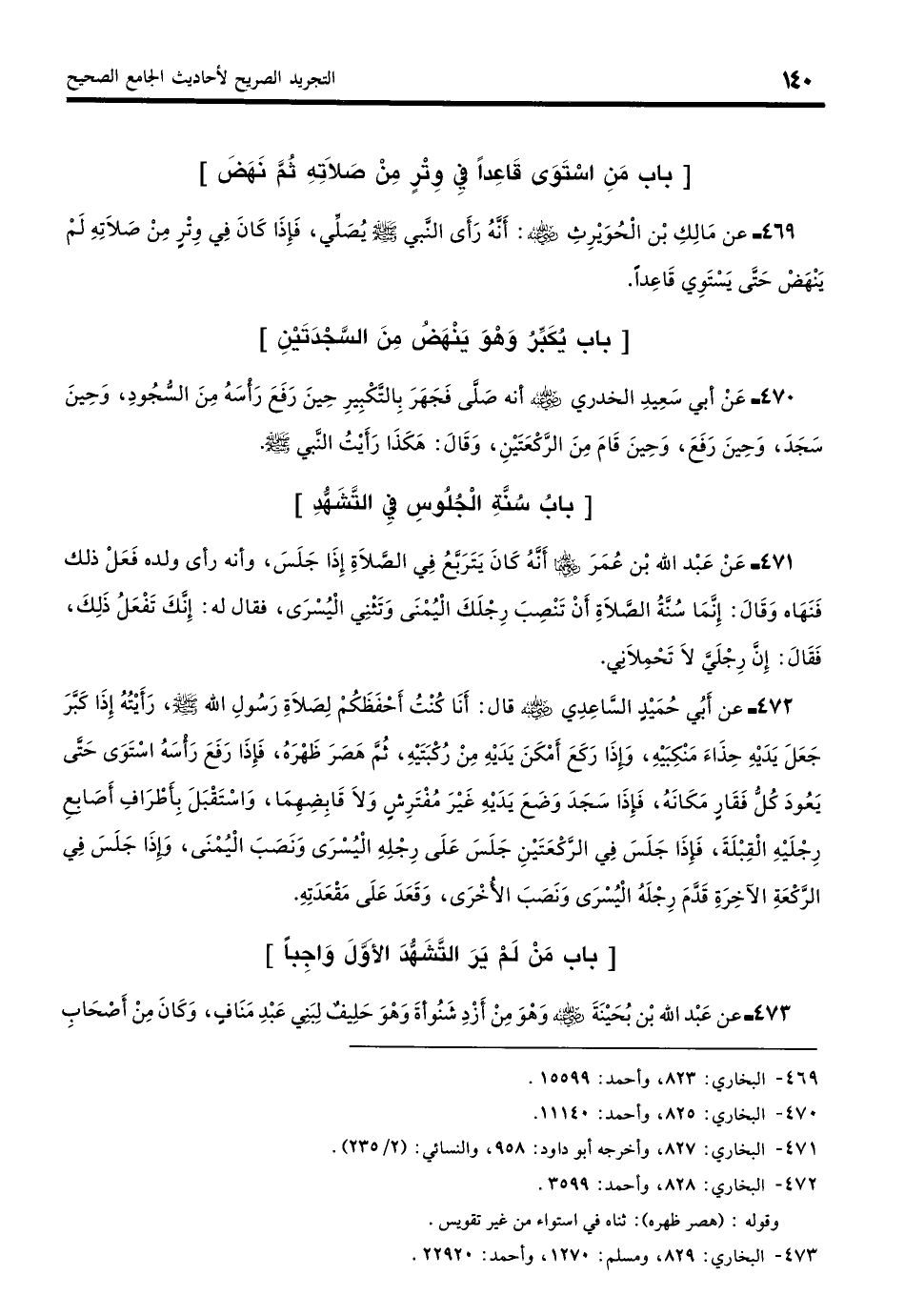 469 - عن مَالِكِ بْنِ الْحُوَيْرِثِ اللَّيْثِيِّ - رضي الله عنه -: أَنَّهُ رَأَى النَّبِيَّ - صلى الله عليه وسلم - يُصَلِّي، فَإِذَا كَانَ فِي وِتْرٍ مِنْ صَلاتِهِ لَمْ يَنْهَضْ حَتَّى يَسْتَوِيَ قَاعِدًا. (بخاري: 823)