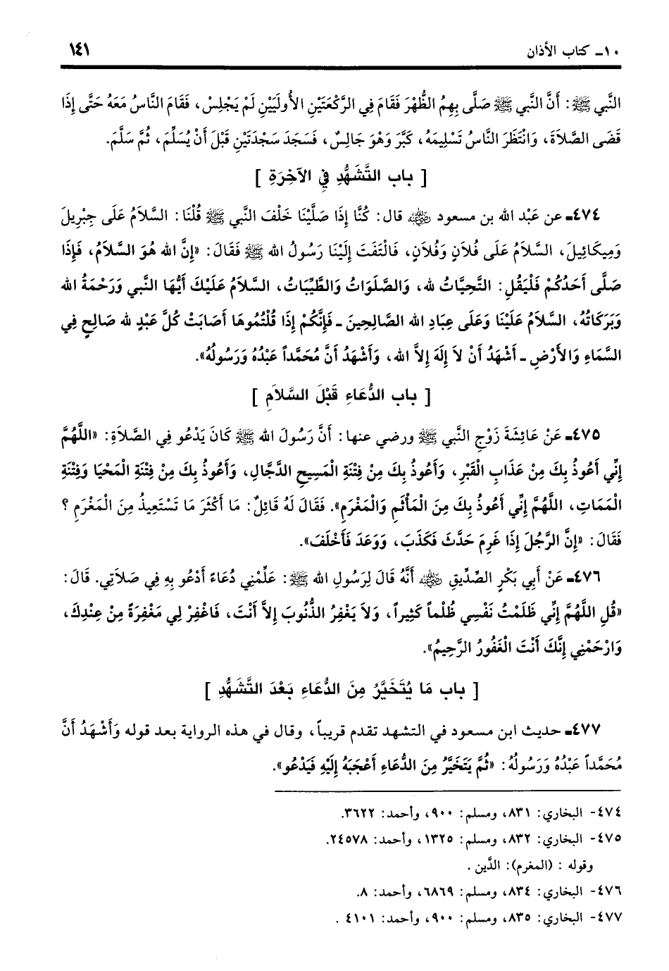 474 - عَنْ عَبْدِ اللَّهِ بْنِ مَسْعُوْدٍ - رضي الله عنه - قَالَ: كُنَّا إِذَا صَلَّيْنَا خَلْفَ النَّبِيِّ - صلى الله عليه وسلم - قُلْنَا: السَّلامُ عَلَى جِبْرِيلَ وَمِيكَائِيلَ، السَّلامُ عَلَى فُلانٍ وَفُلانٍ، فَالْتَفَتَ إِلَيْنَا رَسُولُ اللَّهِ - صلى الله عليه وسلم - فَقَالَ: «إِنَّ اللَّهَ هُوَ السَّلامُ، فَإِذَا صَلَّى أَحَدُكُمْ فَلْيَقُلِ: التَّحِيَّاتُ لِلَّهِ وَالصَّلَوَاتُ وَالطَّيِّبَاتُ السَّلامُ عَلَيْكَ أَيُّهَا النَّبِيُّ وَرَحْمَةُ اللَّهِ وَبَرَكَاتُهُ السَّلامُ عَلَيْنَا وَعَلَى عِبَادِ اللَّهِ الصَّالِحِينَ، فَإِنَّكُمْ إِذَا قُلْتُمُوهَا أَصَابَتْ كُلَّ عَبْدٍ لِلَّهِ صَالِحٍ فِي السَّمَاءِ وَالأَرْضِ، أَشْهَدُ أَنْ لا إِلَهَ إِلا اللَّهُ وَأَشْهَدُ أَنَّ مُحَمَّدًا عَبْدُهُ وَرَسُولُهُ». (بخاري: 831)