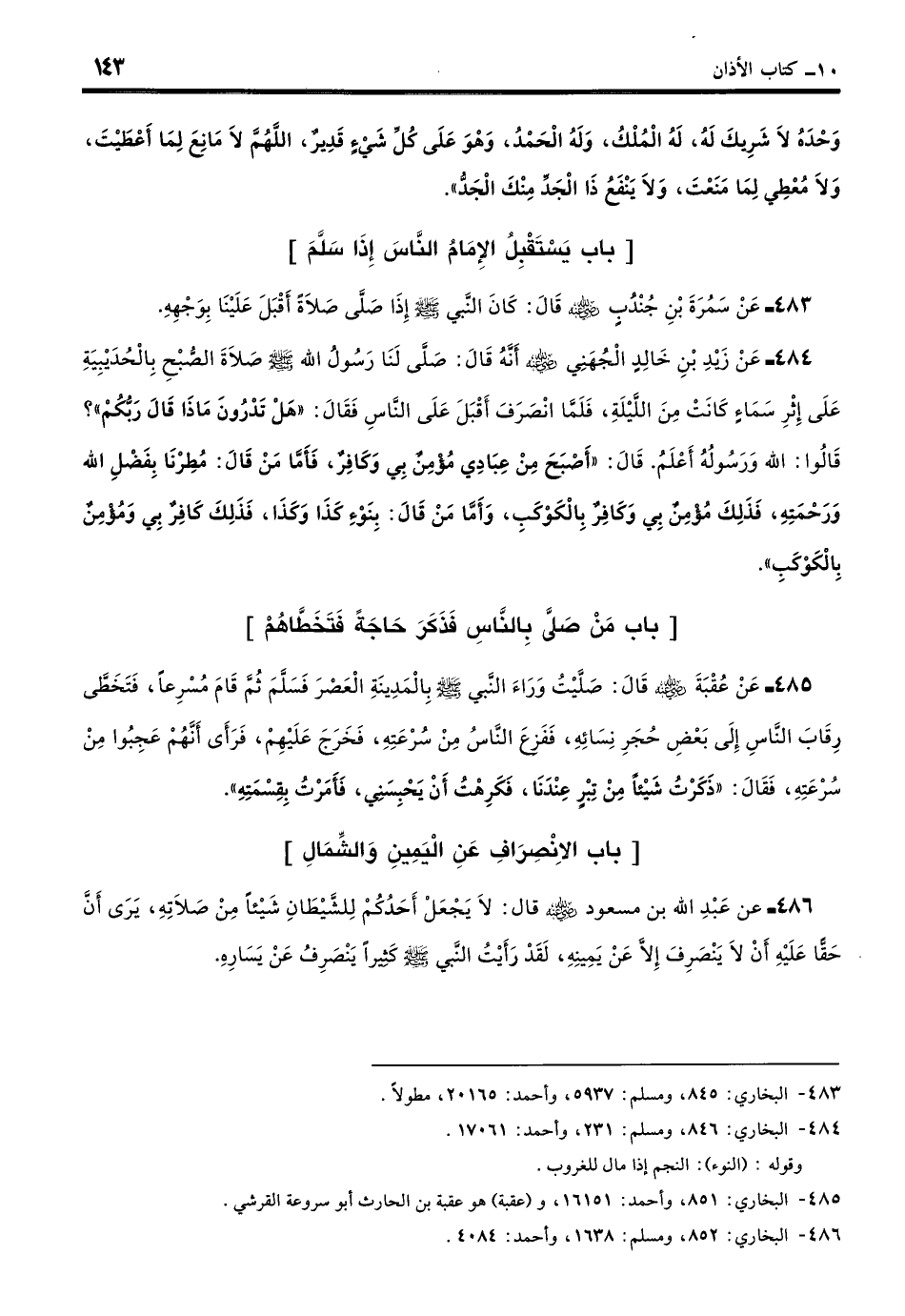 483 - عَنْ سَمُرَةَ بْنِ جُنْدَبٍ - رضي الله عنه - قَالَ: كَانَ النَّبِيُّ - صلى الله عليه وسلم - إِذَا صَلَّى صَلاةً أَقْبَلَ عَلَيْنَا بِوَجْهِهِ. (بخاري: 845)