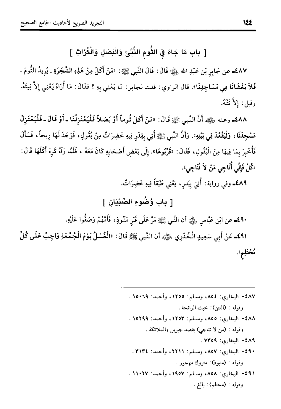 487 - عن جَابِرِ بْنِ عَبْدِ اللَّهِ - رضي الله عنه - قَالَ: قَالَ النَّبِيُّ - صلى الله عليه وسلم -: «مَنْ أَكَلَ مِنْ هَذِهِ الشَّجَرَةِ -يُرِيدُ الثُّومَ-فَلا يَغْشَانَا فِي مَسَاجِدِنَا». قُلْتُ: مَا يَعْنِي بِهِ؟ قَالَ: مَا أُرَاهُ يَعْنِي إِلَّا نِيئَهُ. وقِيْلَ: إِلَّا نَتْنَهُ. (بخاري: 854)