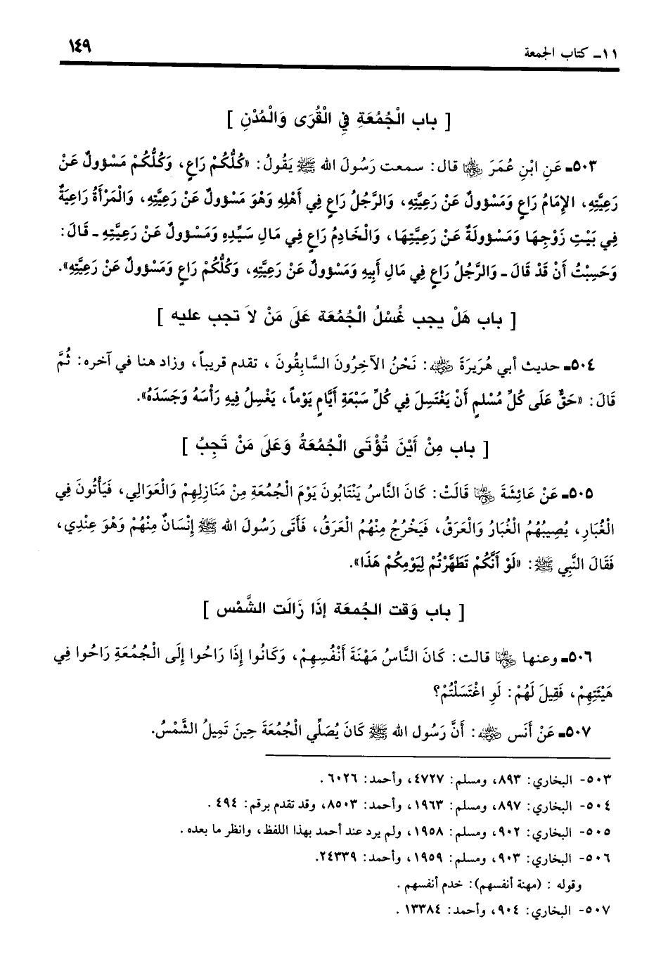 507 - عَنْ أَنَسِ بْنِ مَالِكٍ - رضي الله عنه -: أَنَّ النَّبِيَّ - صلى الله عليه وسلم - كَانَ يُصَلِّي الْجُمُعَةَ حِينَ تَمِيلُ الشَّمْسُ. (بخاري: 905)