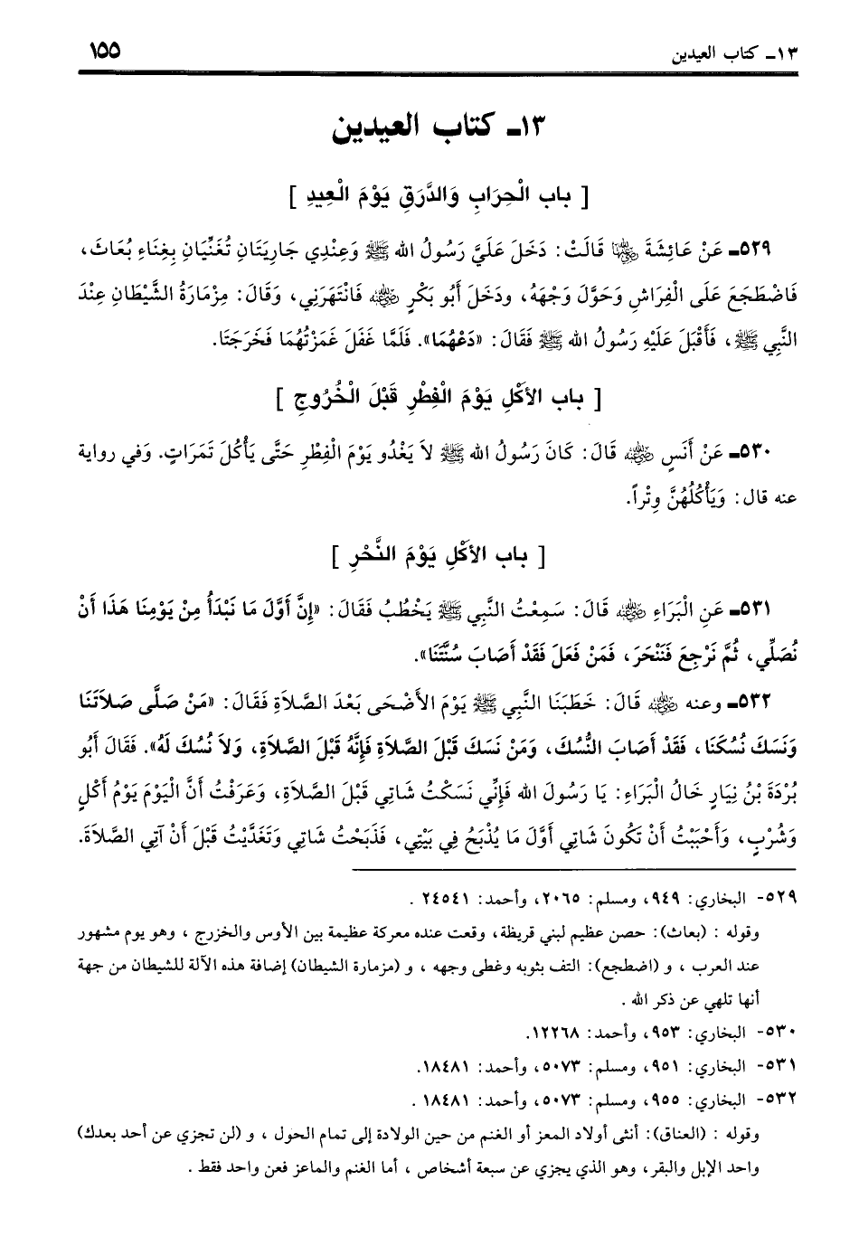 531 - عَنِ الْبَرَاءِ بْنِ عَازِبٍ - رضي الله عنه - قَالَ: سَمِعْتُ رَسُوْلُ الله - صلى الله عليه وسلم - يَخْطُبُ فَقَالَ: «إِنَّ أَوَّلَ مَا نَبْدَأُ فِي يَوْمِنَا هَذَا أَنْ نُصَلِّيَ ثُمَّ نَرْجِعَ فَنَنْحَرَ، فَمَنْ فَعَلَ ذَلِكَ فَقَدْ أَصَابَ سُنَّتَنَا». (بخاري: 951)