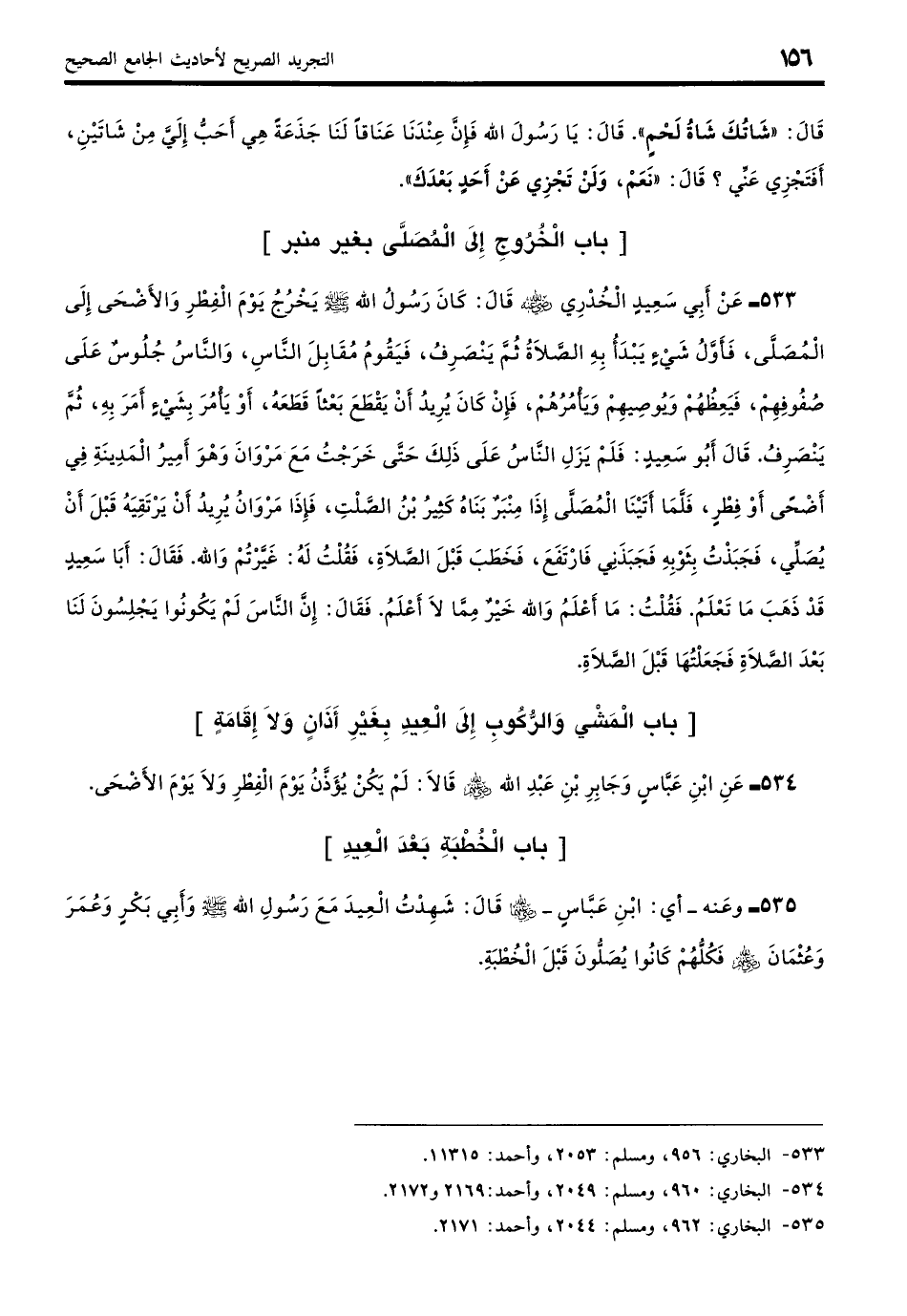 533 - عَنْ أَبِي سَعِيدٍ الْخُدْرِيِّ - رضي الله عنه - قَالَ: كَانَ رَسُولُ اللَّهِ - صلى الله عليه وسلم - يَخْرُجُ يَوْمَ الْفِطْرِ وَالأَضْحَى إِلَى الْمُصَلَّى، فَأَوَّلُ شَيْءٍ يَبْدَأُ بِهِ الصَّلاةُ، ثُمَّ يَنْصَرِفُ فَيَقُومُ مُقَابِلَ النَّاسِ وَالنَّاسُ جُلُوسٌ عَلَى صُفُوفِهِمْ، فَيَعِظُهُمْ وَيُوصِيهِمْ وَيَأْمُرُهُمْ، فَإِنْ كَانَ يُرِيدُ أَنْ يَقْطَعَ بَعْثًا قَطَعَهُ أَوْ يَأْمُرَ بِشَيْءٍ أَمَرَ بِهِ، ثُمَّ يَنْصَرِفُ. قَالَ أَبُو سَعِيدٍ: فَلَمْ يَزَلِ النَّاسُ عَلَى ذَلِكَ حَتَّى خَرَجْتُ مَعَ مَرْوَانَ وَهُوَ أَمِيرُ الْمَدِينَةِ فِي أَضْحًى أَوْ فِطْرٍ، فَلَمَّا أَتَيْنَا الْمُصَلَّى إِذَا مِنْبَرٌ بَنَاهُ كَثِيرُ بْنُ الصَّلْتِ، فَإِذَا مَرْوَانُ يُرِيدُ أَنْ يَرْتَقِيَهُ قَبْلَ أَنْ يُصَلِّيَ، فَجَبَذْتُ بِثَوْبِهِ فَجَبَذَنِي، فَارْتَفَعَ فَخَطَبَ قَبْلَ الصَّلاةِ، فَقُلْتُ لَهُ: غَيَّرْتُمْ وَاللَّهِ. فَقَالَ: أَبَا سَعِيدٍ، قَدْ ذَهَبَ مَا تَعْلَمُ. فَقُلْتُ: مَا أَعْلَمُ وَاللَّهِ خَيْرٌ مِمَّا لا أَعْلَمُ، فَقَالَ: إِنَّ النَّاسَ لَمْ يَكُونُوا يَجْلِسُونَ لَنَا بَعْدَ الصَّلاةِ، فَجَعَلْتُهَا قَبْلَ الصَّلاةِ. (بخاري: 956)