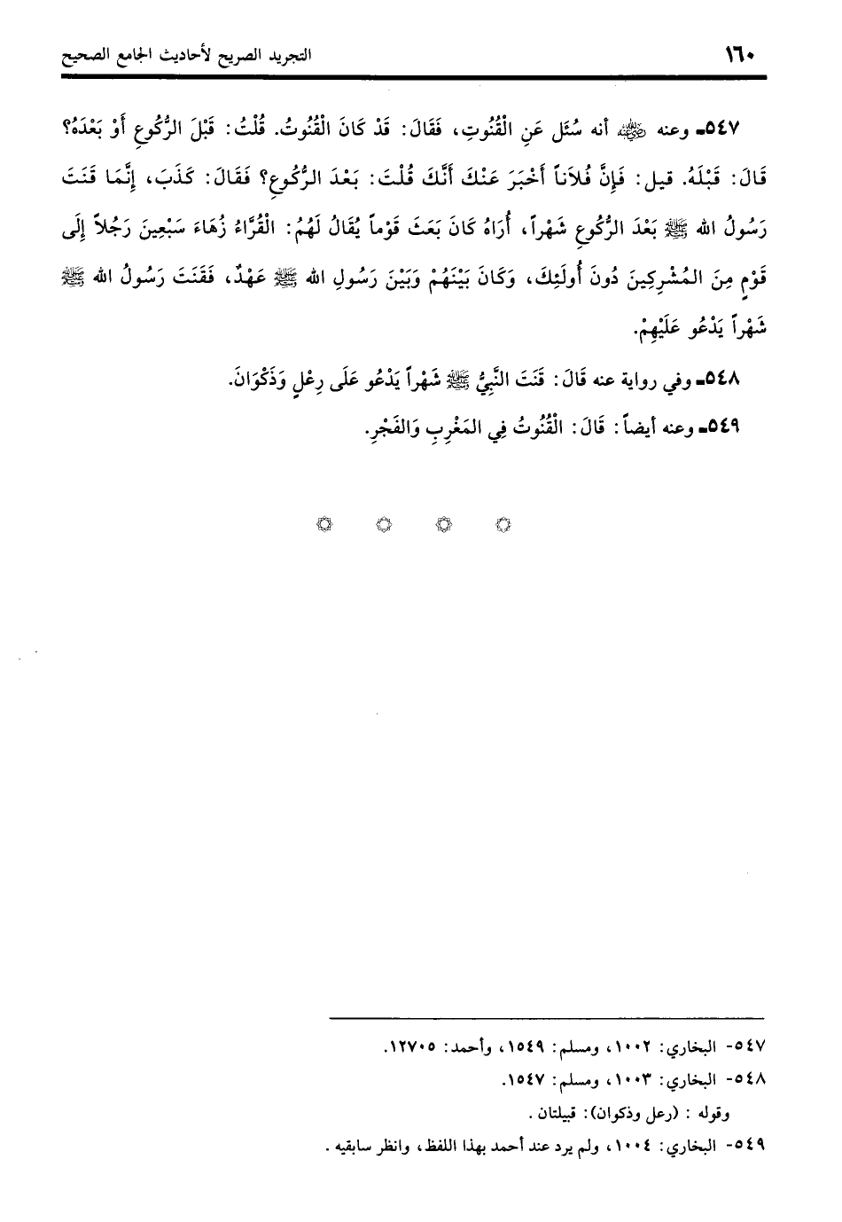 547 - عن أَنَسٍ - رضي الله عنه -: أنَّهُ سُئِلَ عَنِ الْقُنُوتِ فَقَالَ: قَدْ كَانَ الْقُنُوتُ، فَقِيْلَ لَهُ: قَبْلَ الرُّكُوعِ أَوْ بَعْدَهُ؟ قَالَ: قَبْلَهُ. قَالَ: فَإِنَّ فُلانًا أَخْبَرَنِي عَنْكَ أَنَّكَ قُلْتَ بَعْدَ الرُّكُوعِ. فَقَالَ: كَذَبَ، إِنَّمَا قَنَتَ رَسُولُ اللَّهِ - صلى الله عليه وسلم - بَعْدَ الرُّكُوعِ شَهْرًا، أُرَاهُ كَانَ بَعَثَ قَوْمًا يُقَالُ لَهُمُ الْقُرَّاءُ زُهَاءَ سَبْعِينَ رَجُلًا إِلَى قَوْمٍ مِنَ الْمُشْرِكِينَ دُونَ أُولَئِكَ، وَكَانَ بَيْنَهُمْ وَبَيْنَ رَسُولِ اللَّهِ - صلى الله عليه وسلم - عَهْدٌ، فَقَنَتَ رَسُولُ اللَّهِ - صلى الله عليه وسلم - شَهْرًا يَدْعُو عَلَيْهِمْ. (بخاري: 1002)