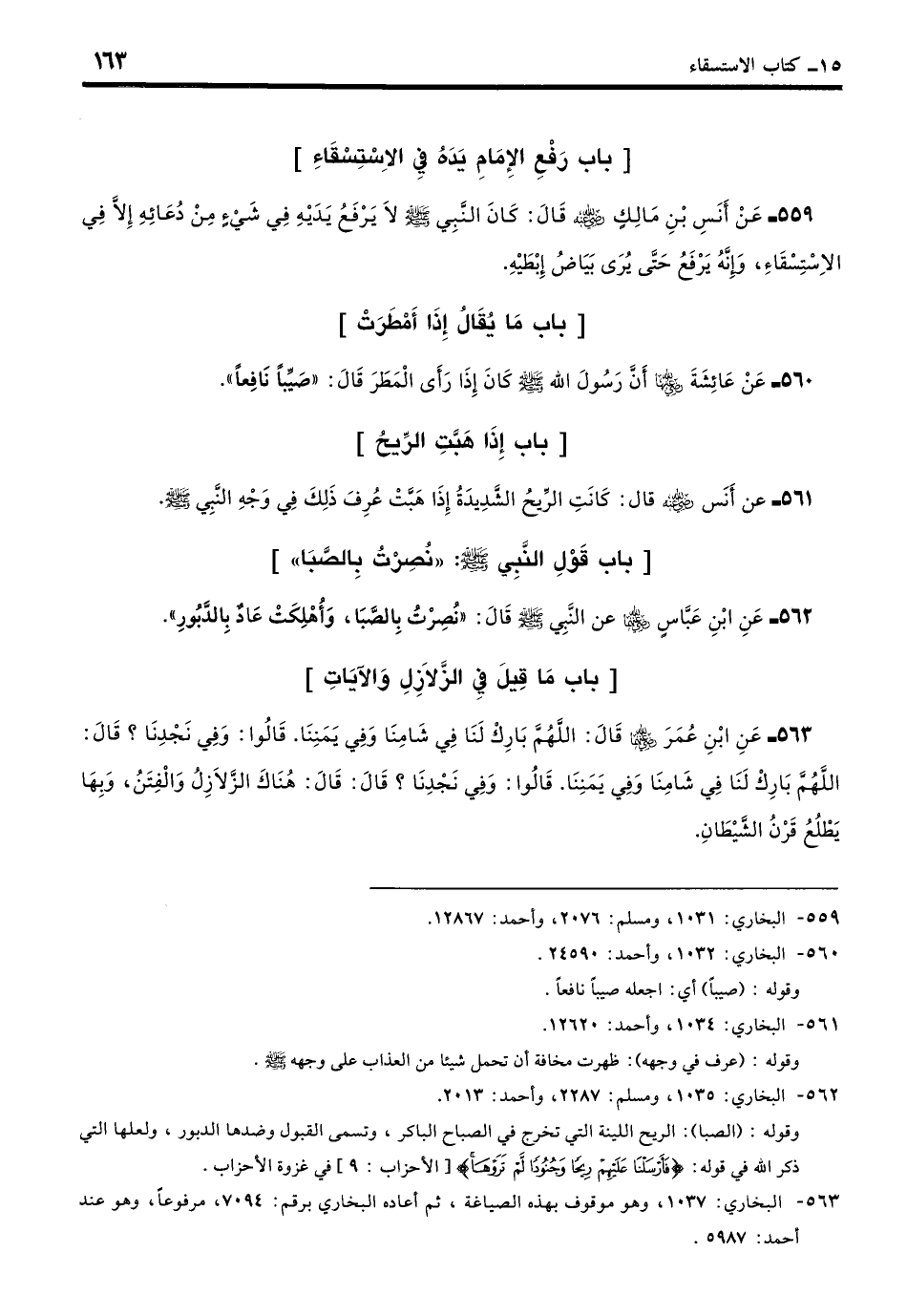 559 - عَنْ أَنَسٍ - رضي الله عنه - قَالَ: كَانَ النَّبِيُّ - صلى الله عليه وسلم - لا يَرْفَعُ يَدَيْهِ فِي شَيْءٍ مِنْ دُعَائِهِ إِلا فِي الِاسْتِسْقَاءِ، وَإِنَّهُ يَرْفَعُ حَتَّى يُرَى بَيَاضُ إِبْطَيْهِ. (بخاري: 1031)