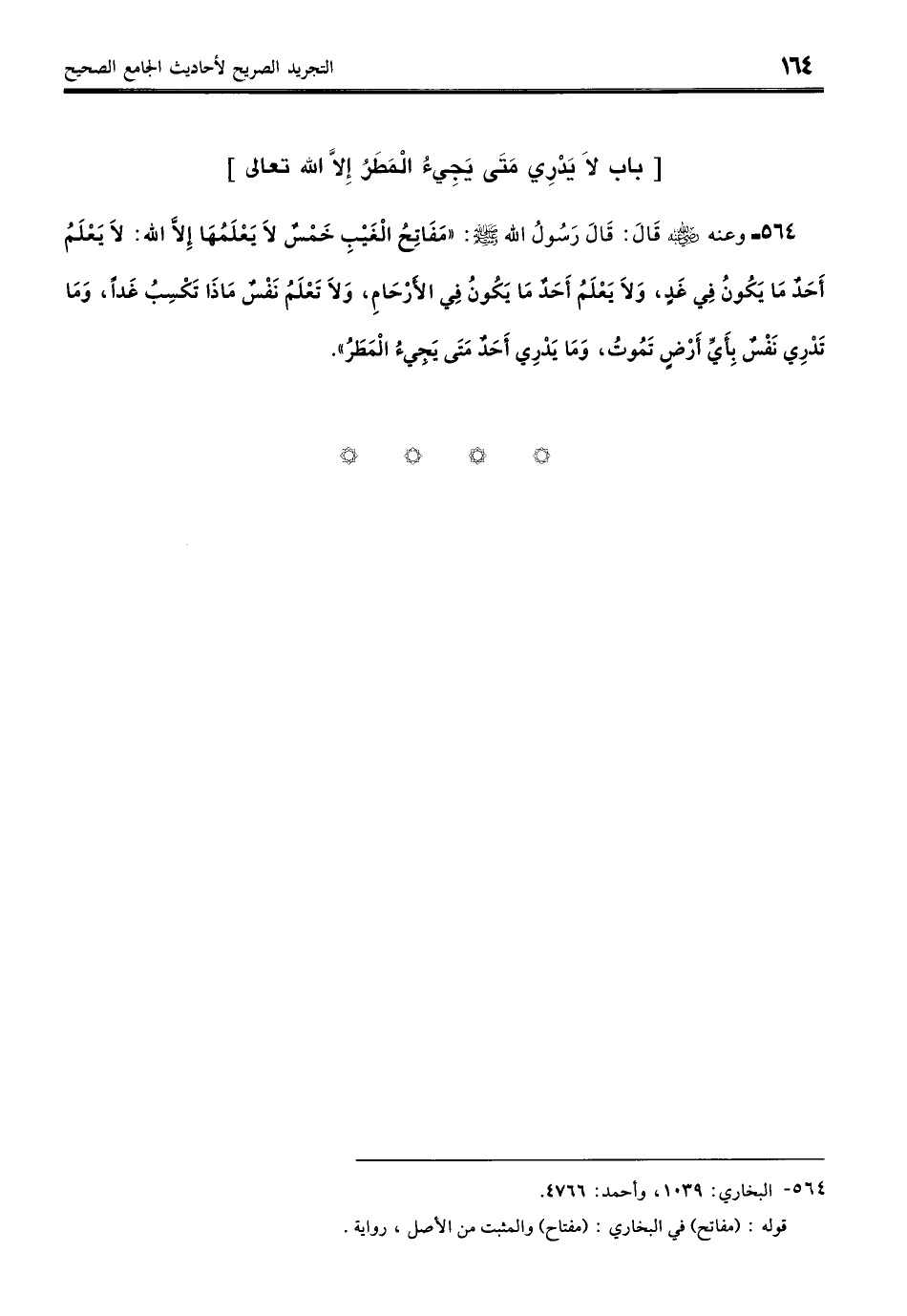 564 - وَعَنْهُ - رضي الله عنه - قَالَ: قَالَ رَسُولُ اللَّهِ - صلى الله عليه وسلم -: «مِفْتَاحُ الْغَيْبِ خَمْسٌ لا يَعْلَمُهَا إِلا اللَّهُ: لا يَعْلَمُ أَحَدٌ مَا يَكُونُ فِي غَدٍ، وَلا يَعْلَمُ أَحَدٌ مَا يَكُونُ فِي الأَرْحَامِ، وَلا تَعْلَمُ نَفْسٌ مَاذَا تَكْسِبُ غَدًا، وَمَا تَدْرِي نَفْسٌ بِأَيِّ أَرْضٍ تَمُوتُ، وَمَا يَدْرِي أَحَدٌ مَتَى يَجِيءُ الْمَطَرُ». (بخاري: 1039)