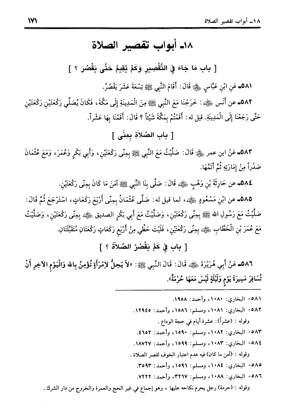 581 - عَنِ ابْنِ عَبَّاسٍ - رضي الله عنهما - قَالَ: أَقَامَ النَّبِيُّ - صلى الله عليه وسلم - تِسْعَةَ عَشَرَ يَقْصُرُ. (بخاري: 1080)