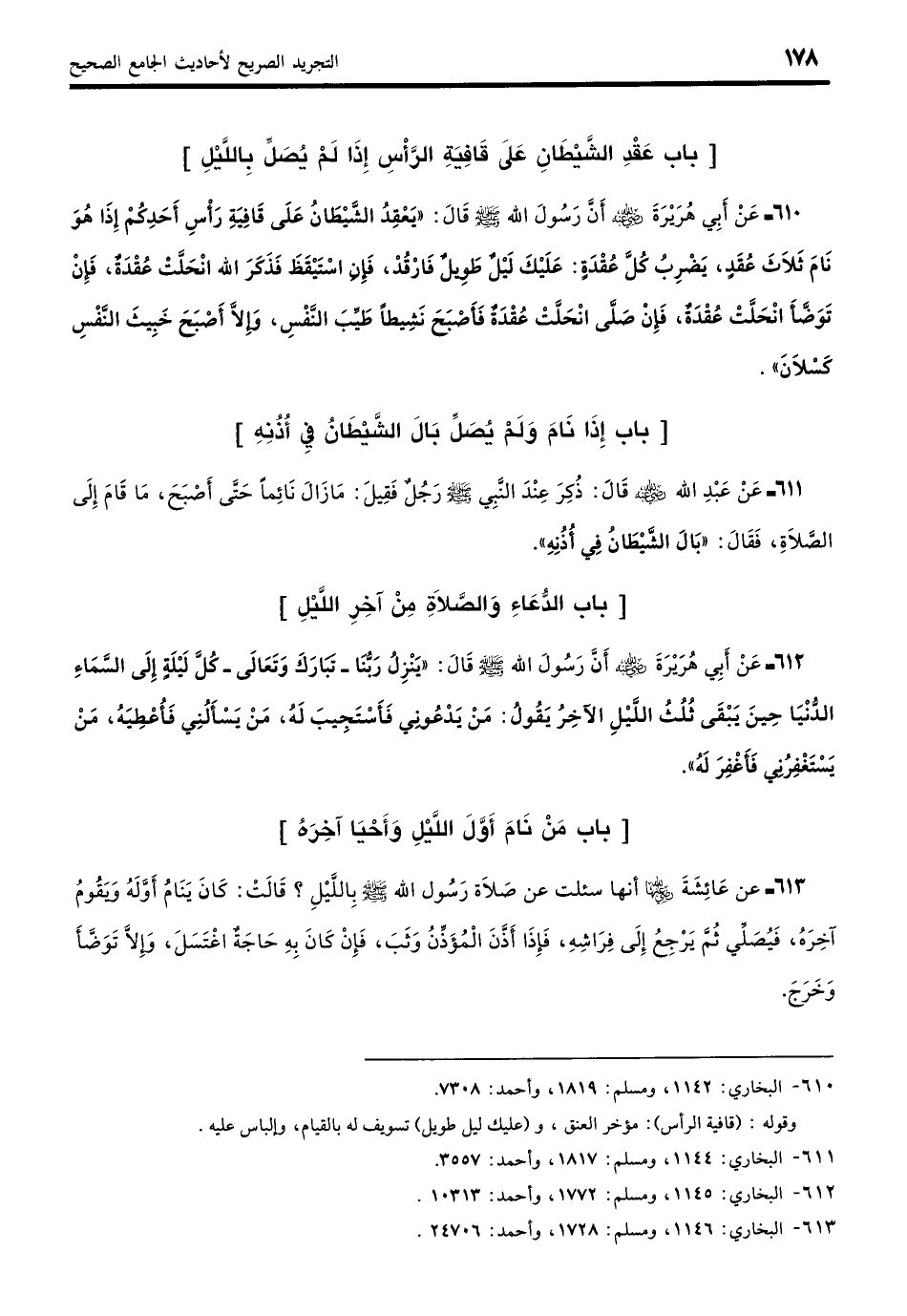 610 - عَنْ أَبِي هُرَيْرَةَ - رضي الله عنه -: أَنَّ رَسُولَ اللَّه - صلى الله عليه وسلم - قَالَ: «يَعْقِدُ الشَّيْطَانُ عَلَى قَافِيَةِ رَأْسِ أَحَدِكُمْ إِذَا هُوَ نَامَ ثَلاثَ عُقَدٍ، يَضْرِبُ كُلَّ عُقْدَةٍ: عَلَيْكَ لَيْلٌ طَوِيلٌ فَارْقُدْ، فَإِنِ اسْتَيْقَظَ فَذَكَرَ اللَّهَ انْحَلَّتْ عُقْدَةٌ، فَإِنْ تَوَضَّأَ انْحَلَّتْ عُقْدَةٌ، فَإِنْ صَلَّى انْحَلَّتْ عُقْدَةٌ فَأَصْبَحَ نَشِيطًا طَيِّبَ النَّفْسِ، وَإِلَّا أَصْبَحَ خَبِيثَ النَّفْسِ كَسْلانَ». (بخاري: 1142)